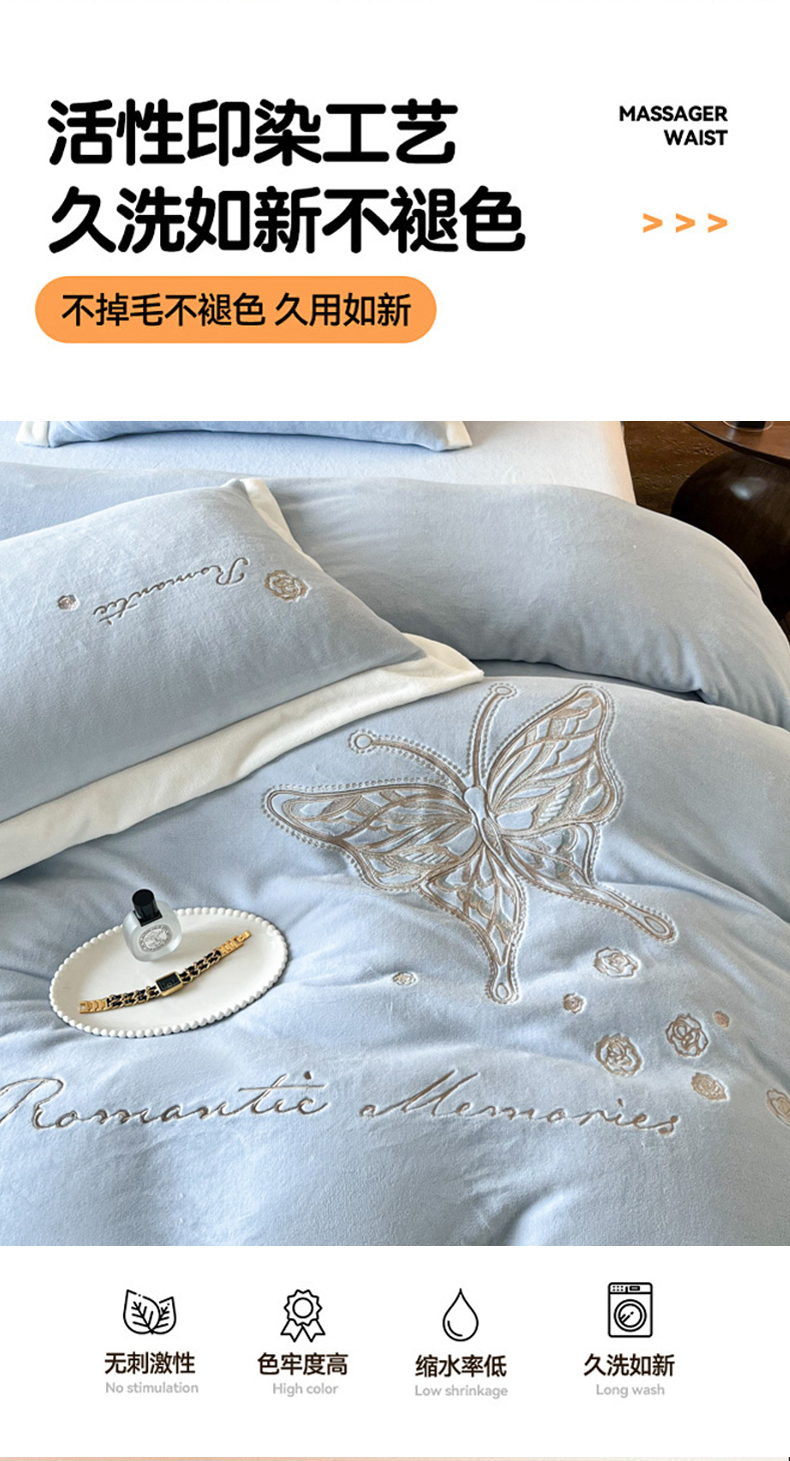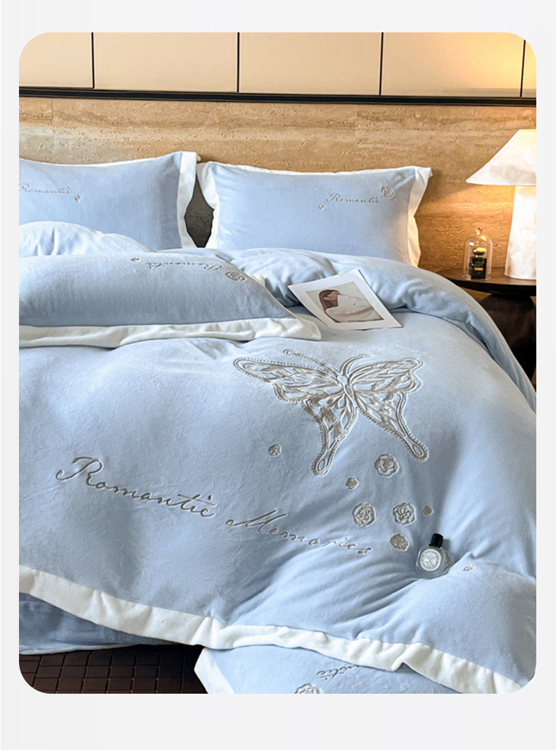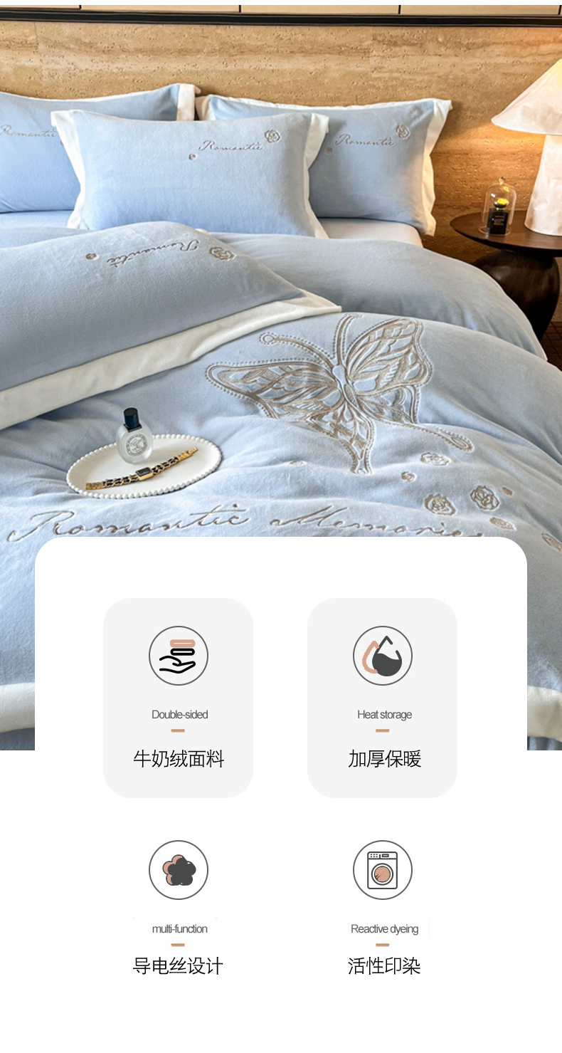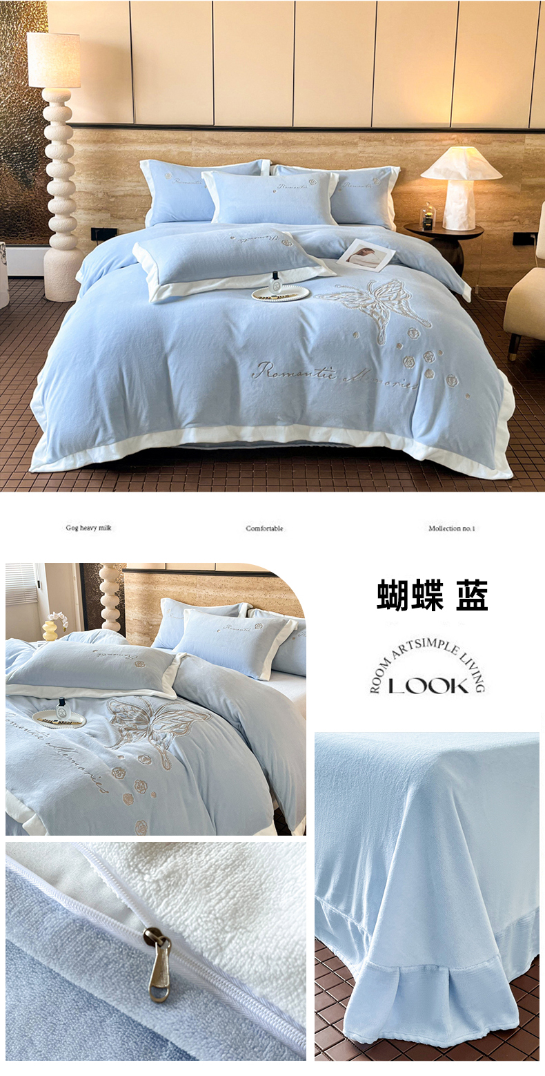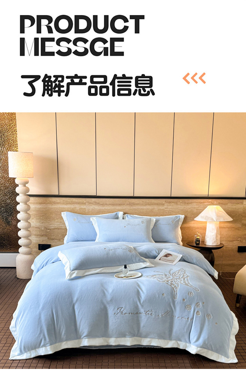 商品名称:恋佳居 2025新款牛奶绒高克重平绣四件套 蝴蝶-蓝