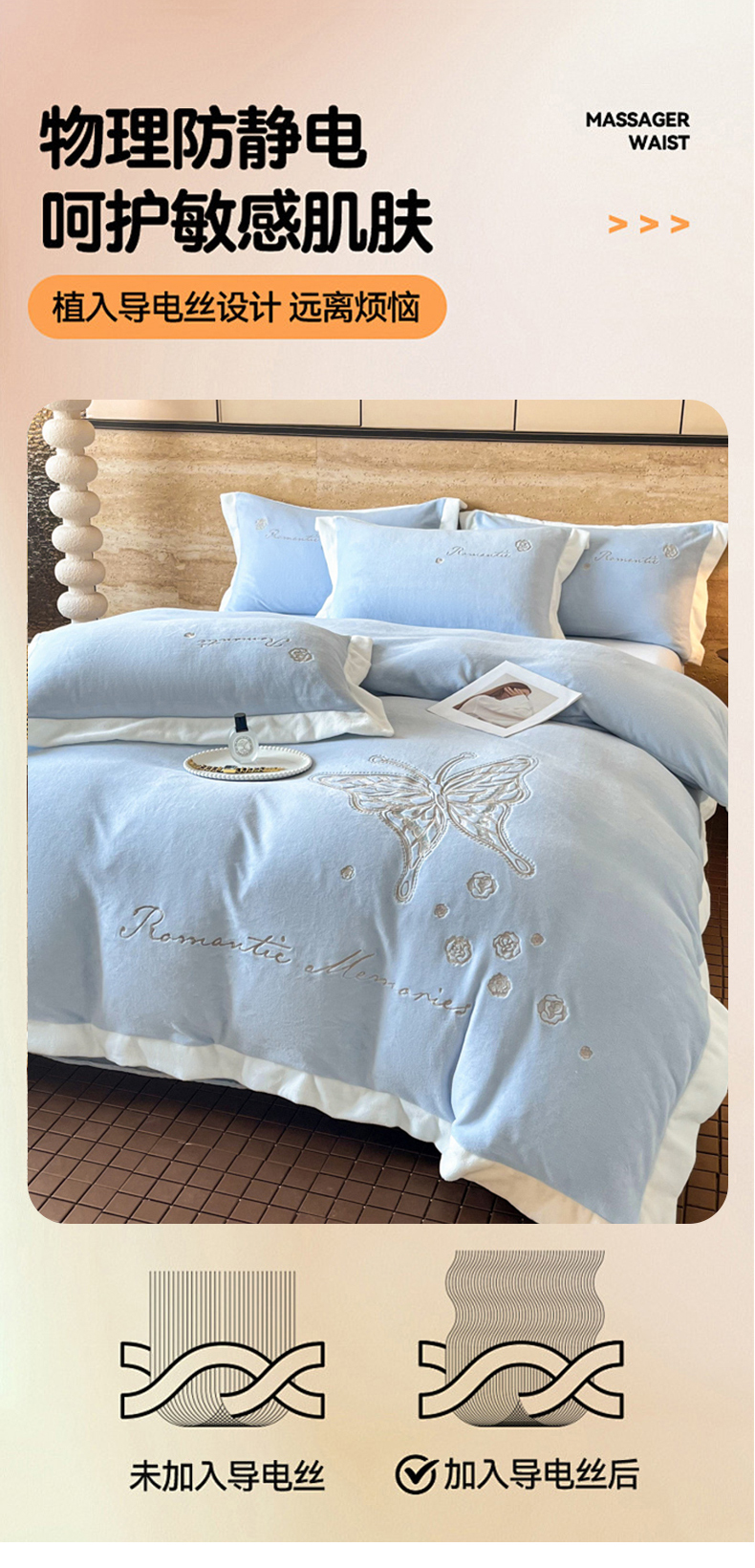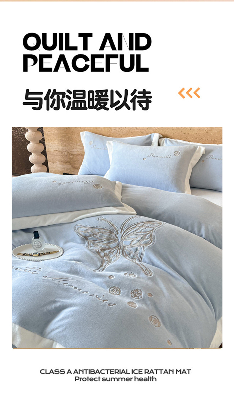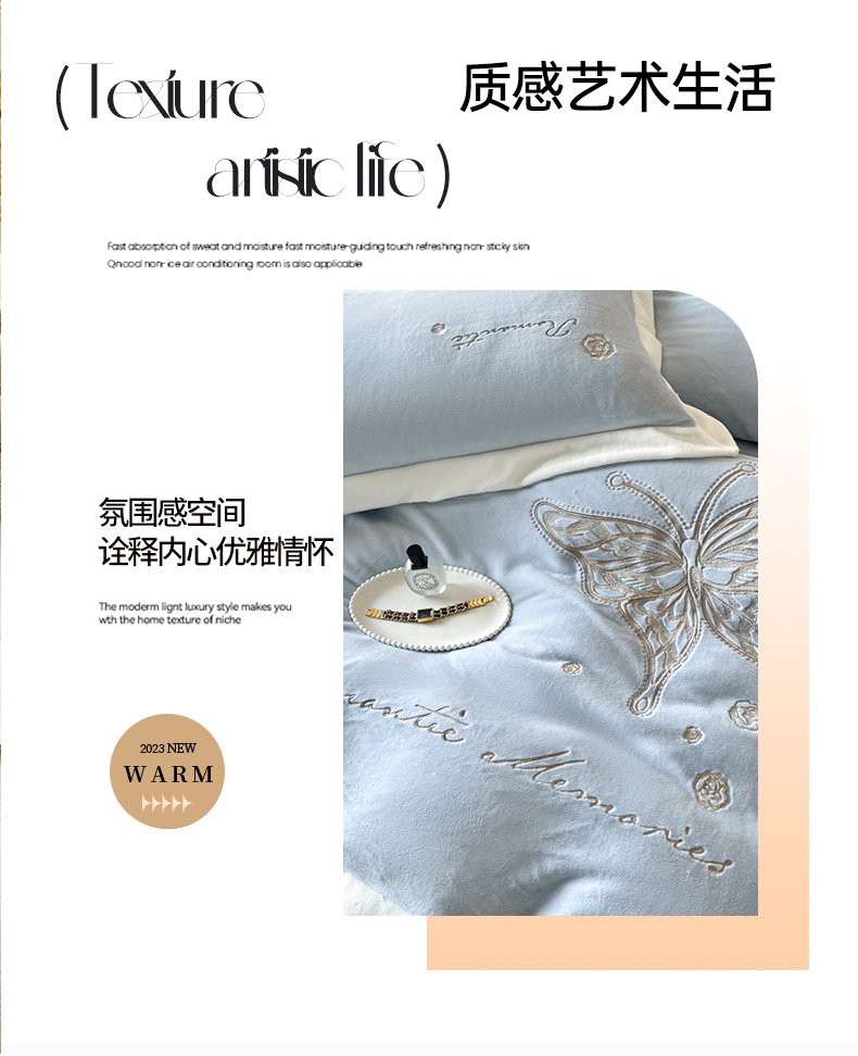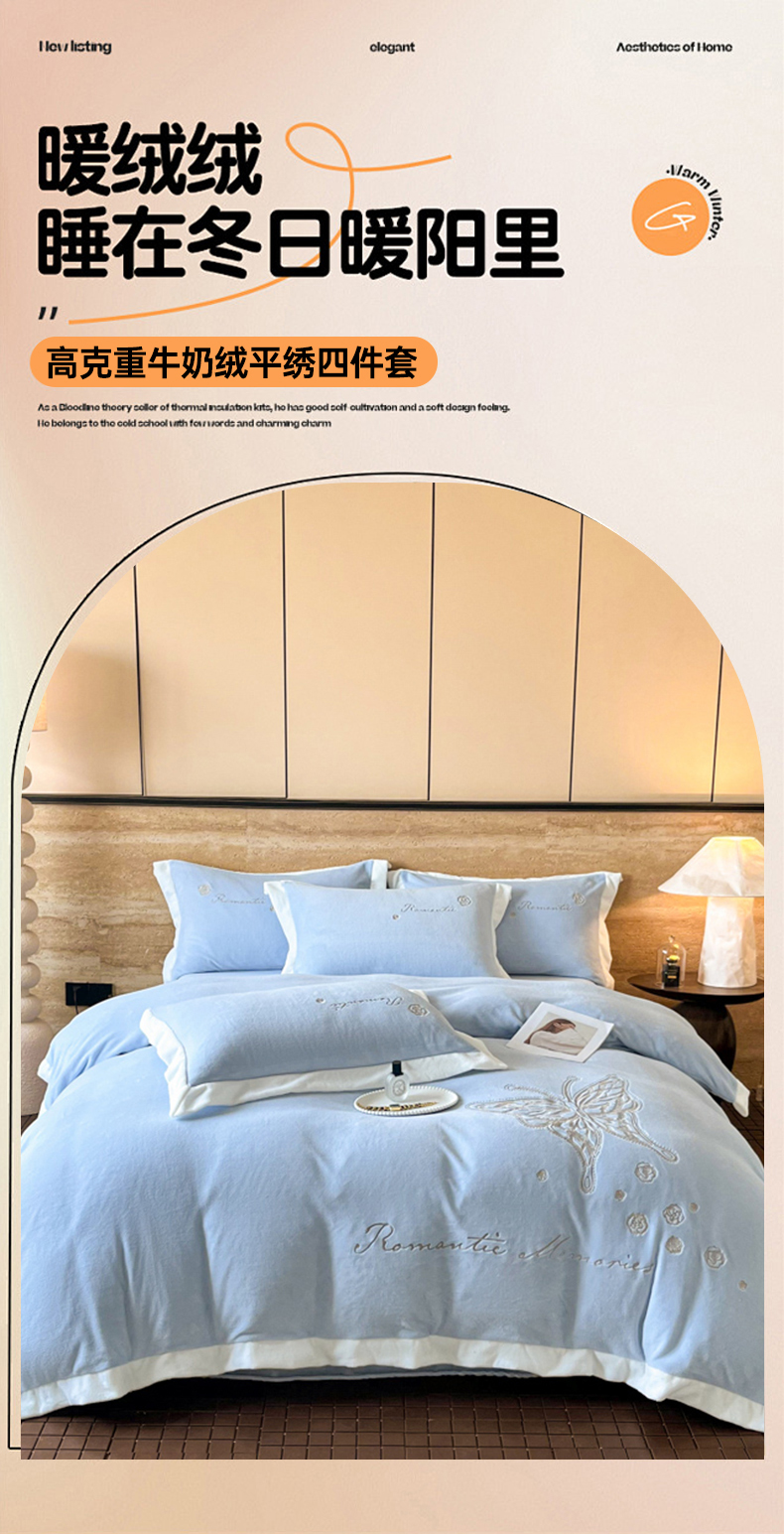 商品名称:恋佳居 2025新款牛奶绒高克重平绣四件套 蝴蝶-蓝
