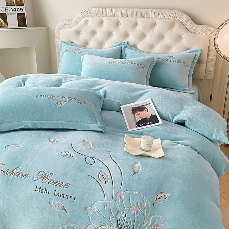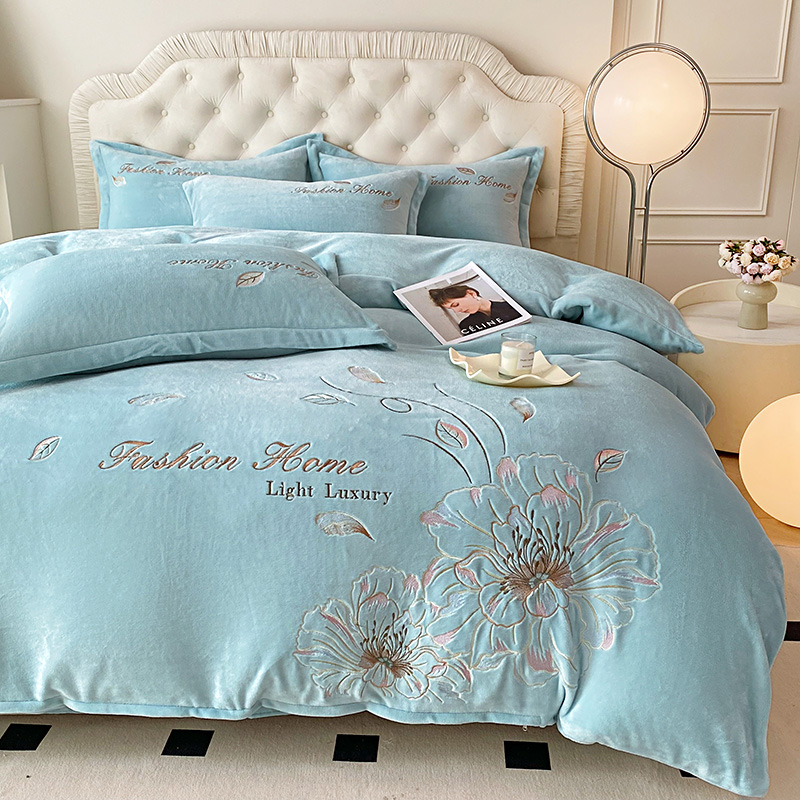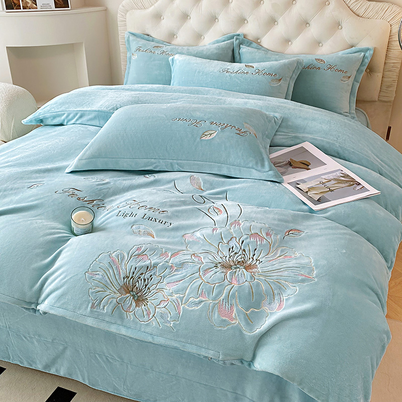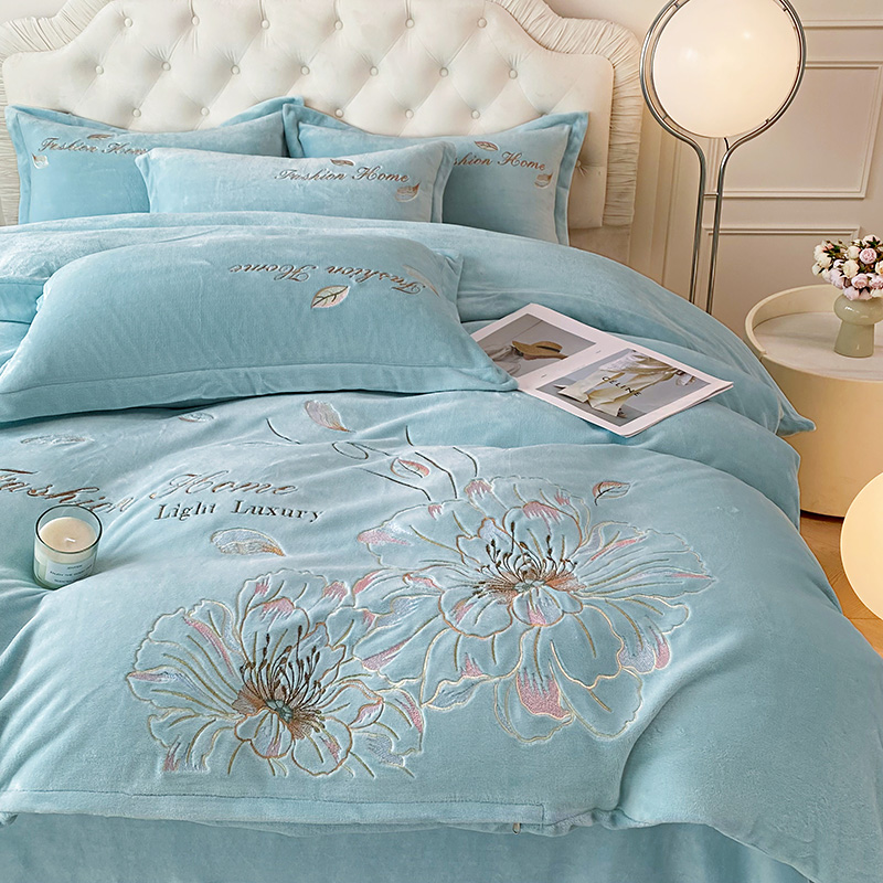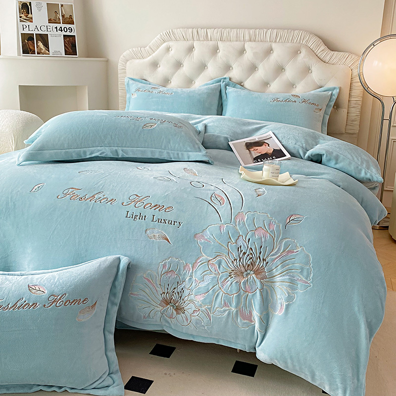 商品名称:航途席业 2025新款高克重牛奶绒刺绣四件套-花漾 花漾-天青色