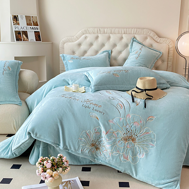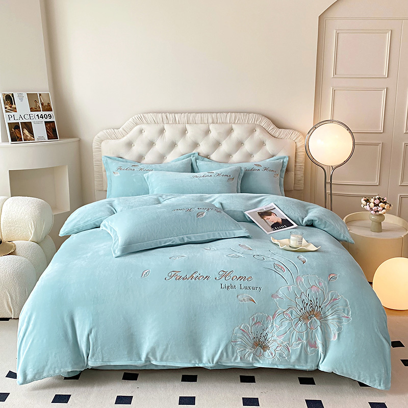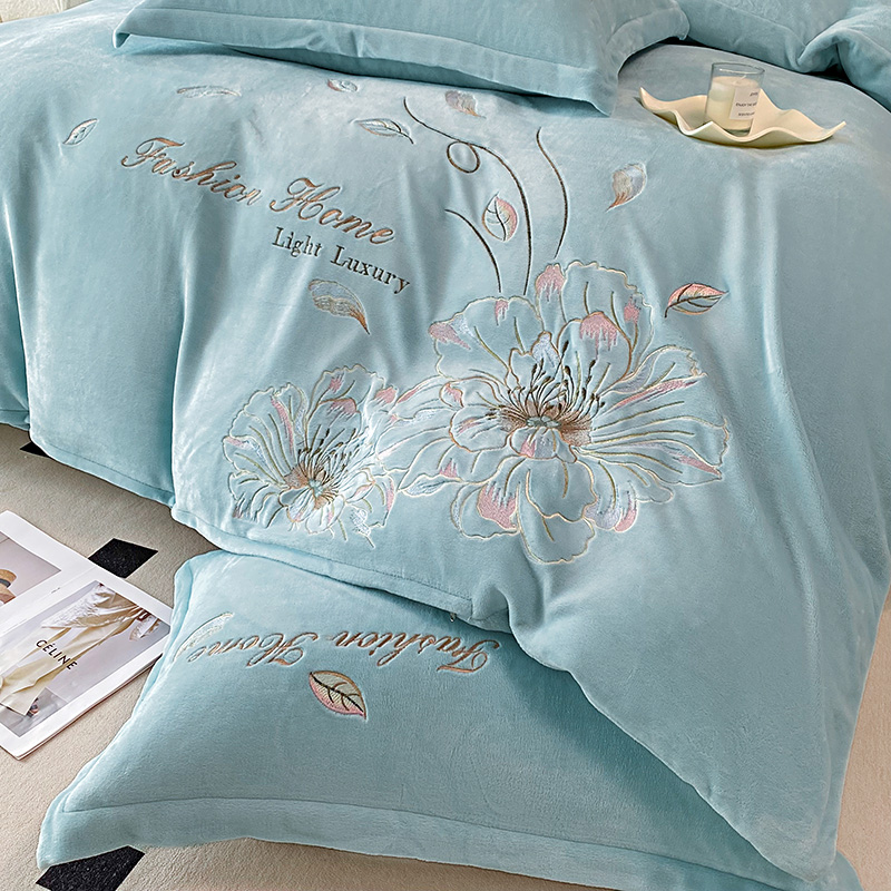 航途席业 2025新款高克重牛奶绒刺绣四件套-花漾 花漾-天青色