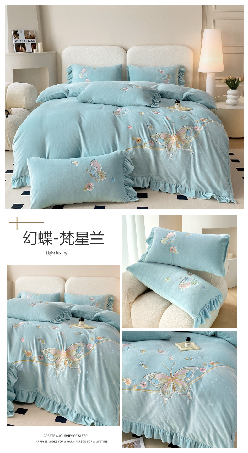 航途席业 2025新款高克重牛奶绒刺绣四件套-梦幻蝶舞 梦幻蝶舞-青色