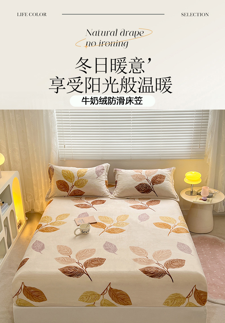 商品名称:圣比熊 2025新款冬季牛奶绒加厚床笠法兰绒床罩套珊瑚绒床垫保护套全包床单 黄金叶