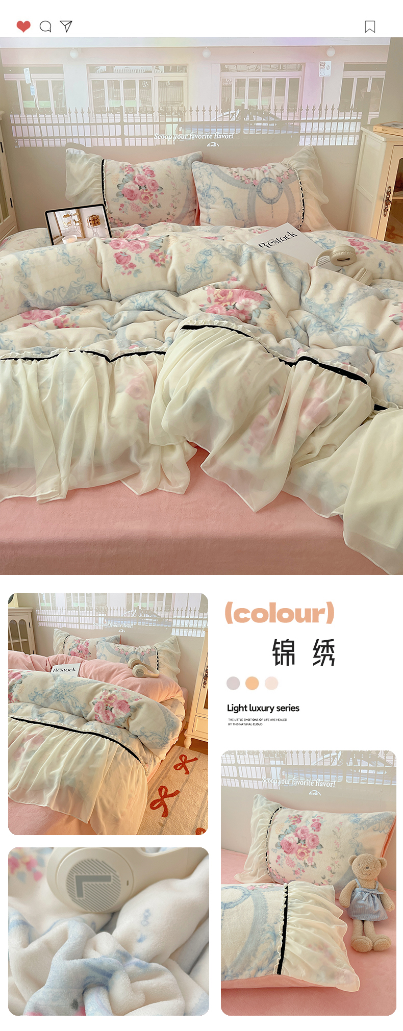 当前位置: 91家纺网 > 商品网购 > 床品套件 > 四件套 > 牛奶绒四件套 > 花漾家居 2024韩版蕾丝织带法式牛奶绒四件套 锦绣