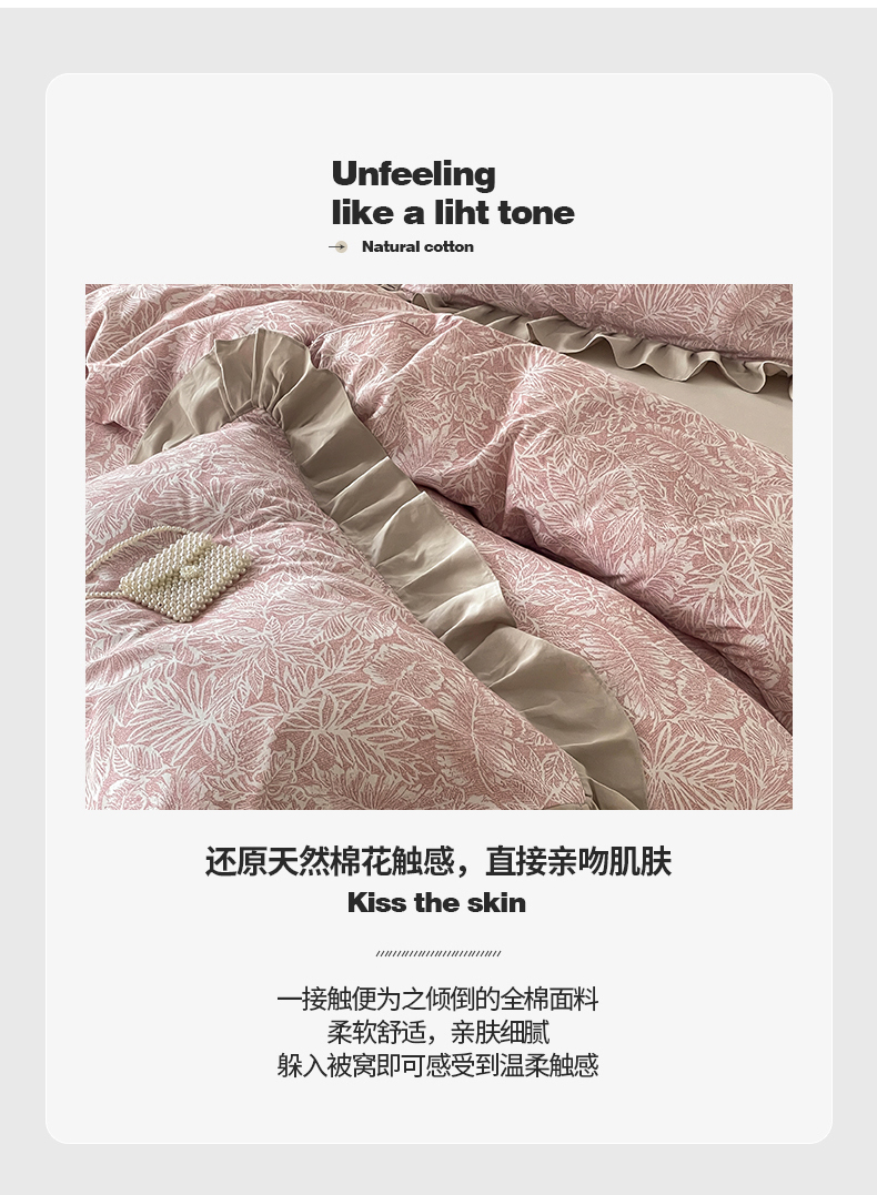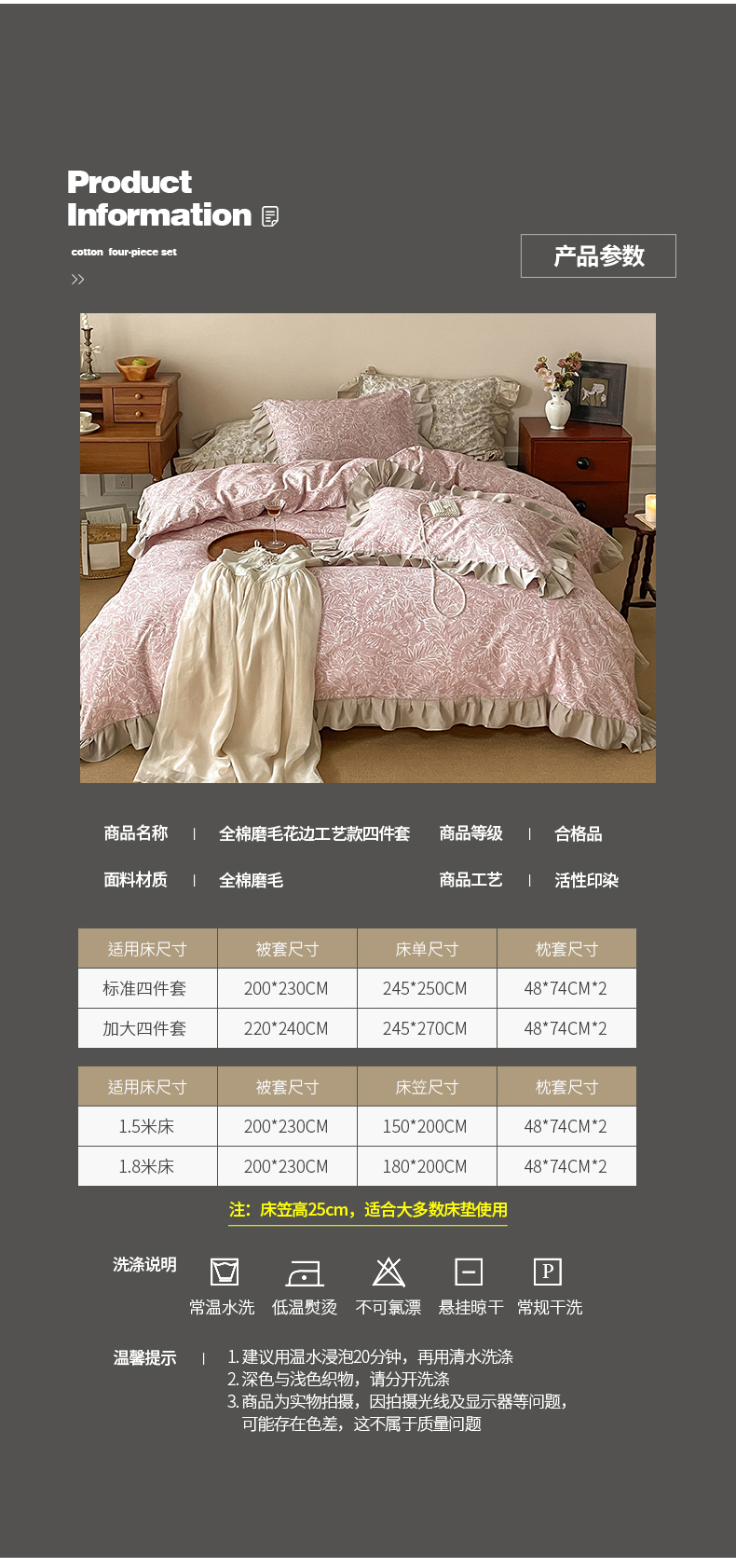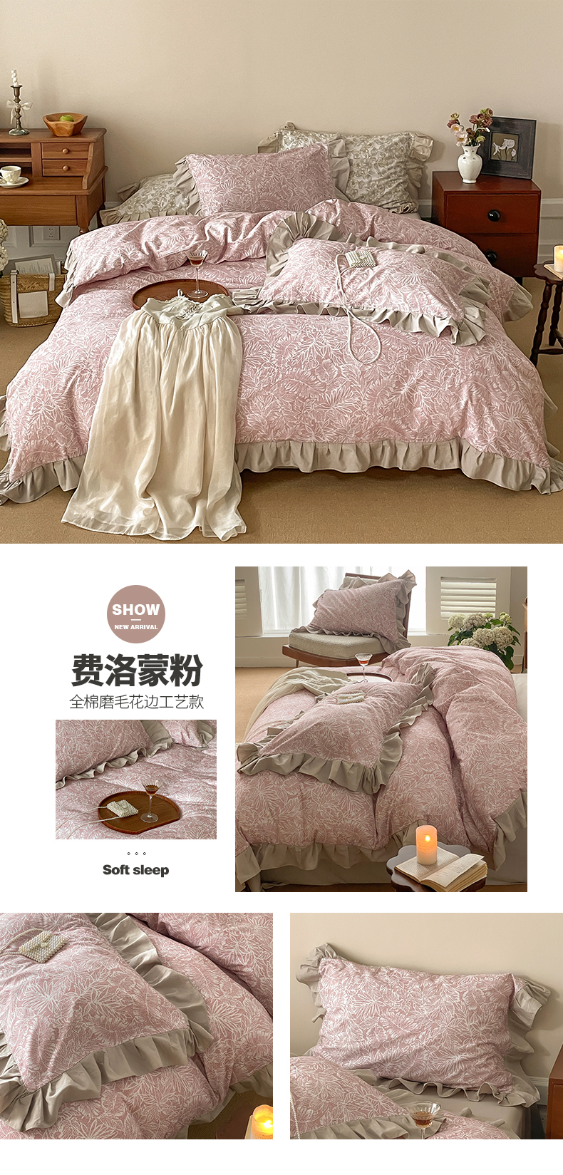 商品名称:窝米 2024新款全棉磨毛花边工艺款四件套 费洛蒙粉