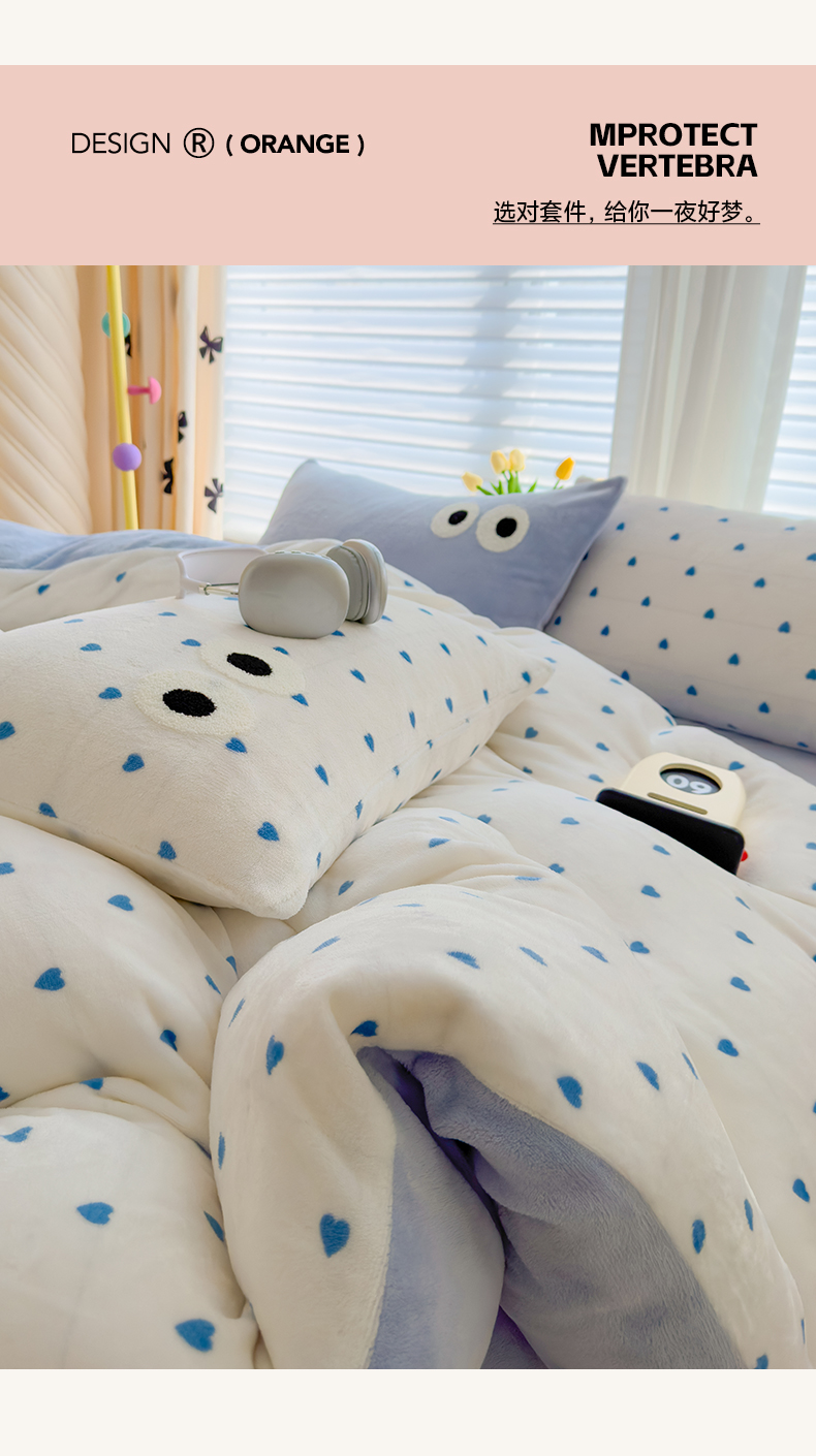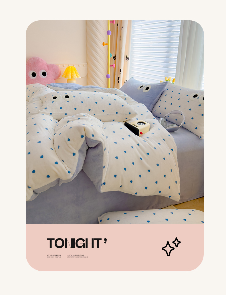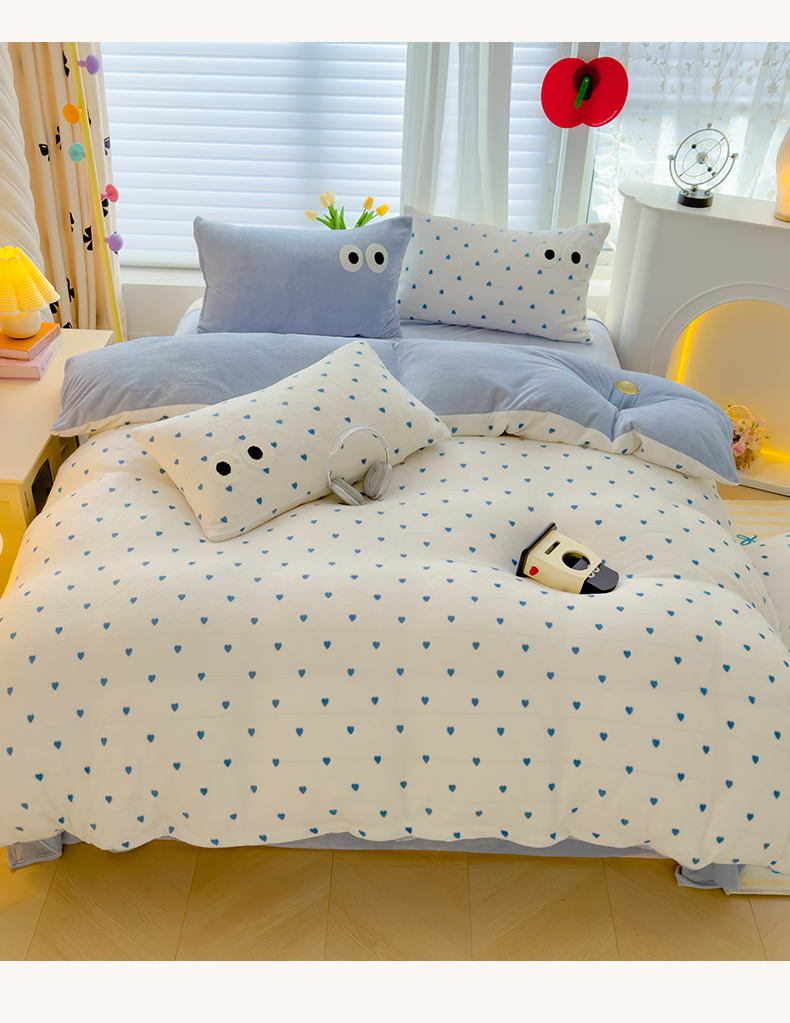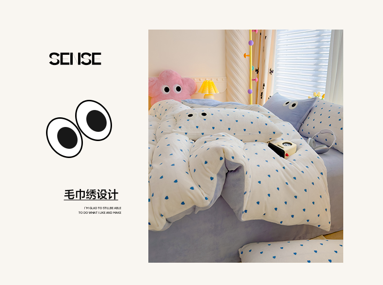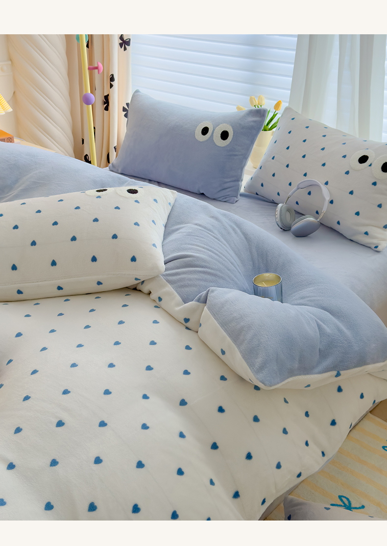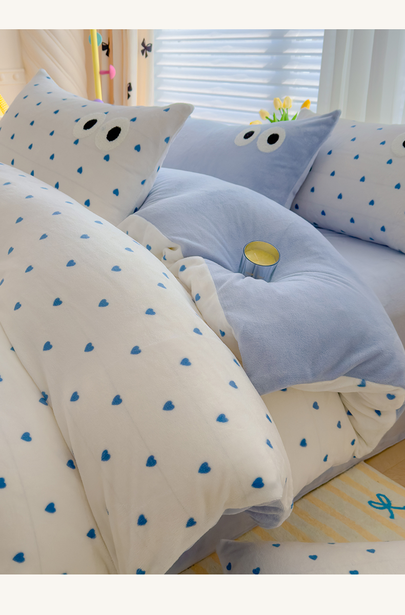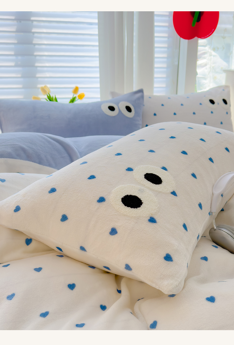 当前位置: 91家纺网 > 商品网购 > 床品套件 > 四件套 > 牛奶绒四件套 > 2024新款牛奶绒毛巾绣四件套-超大大眼睛系列 大眼睛蓝爱心