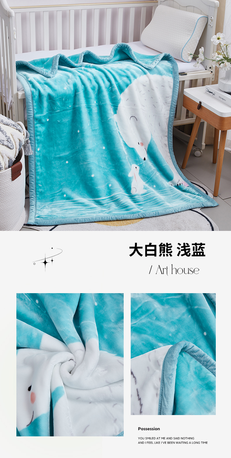 凯轩毛毛毯毯子网销专供 2024新款加厚保暖儿童印花云毛毯毯子系列 大白熊 浅蓝