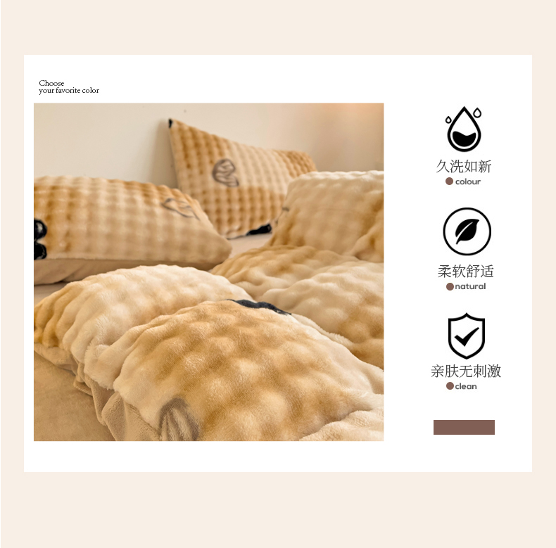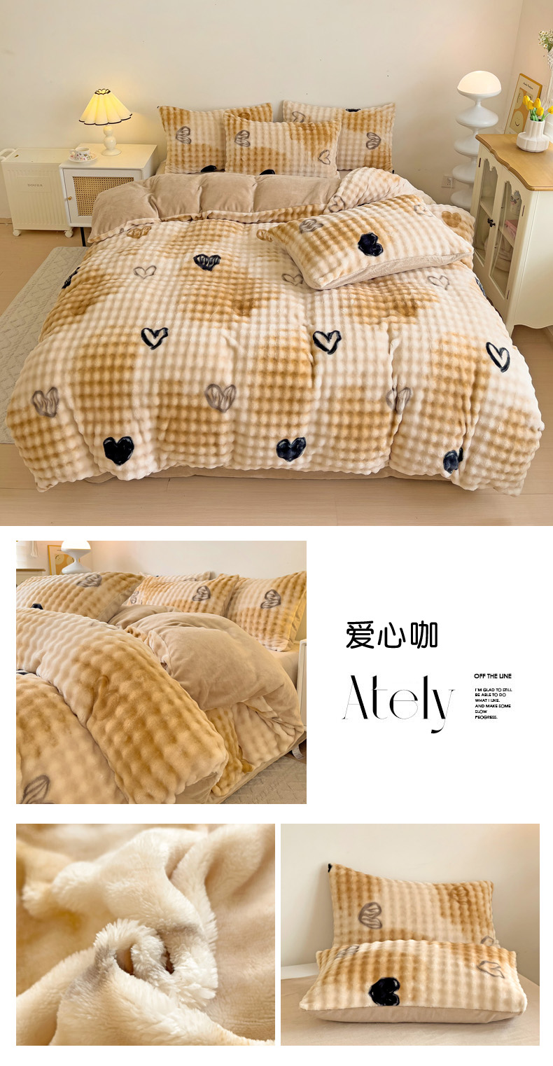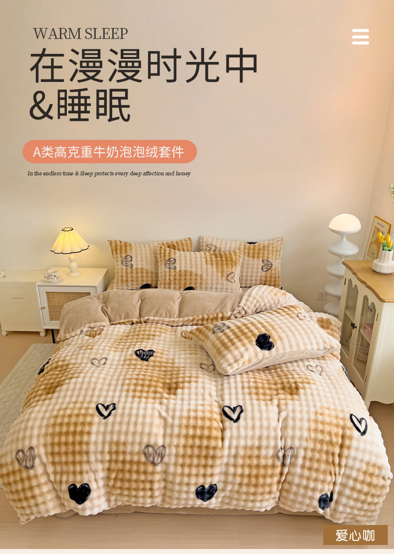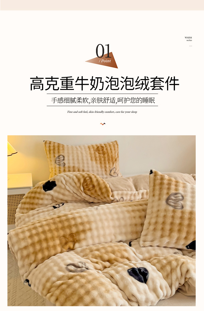 商品名称:金爱家 2024新款A类高克重云朵牛奶泡泡绒四件套 泡泡绒-爱心咖