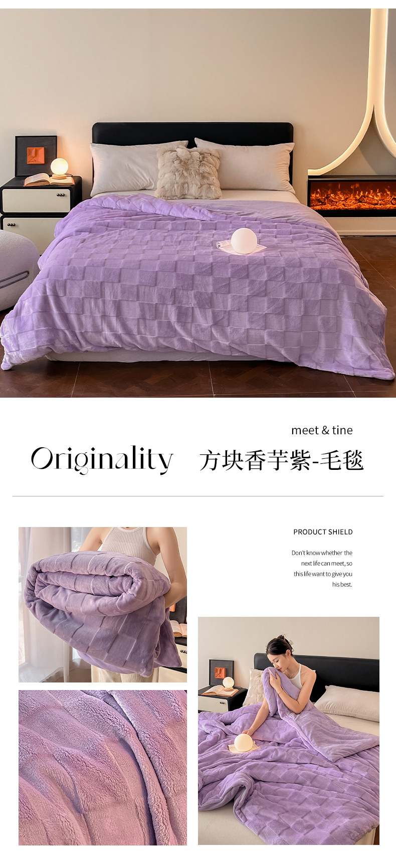 商品名称:2024新款A类法式高克重兔绒多功能毛毯被套双用盖毯 方块香芋紫-毛毯