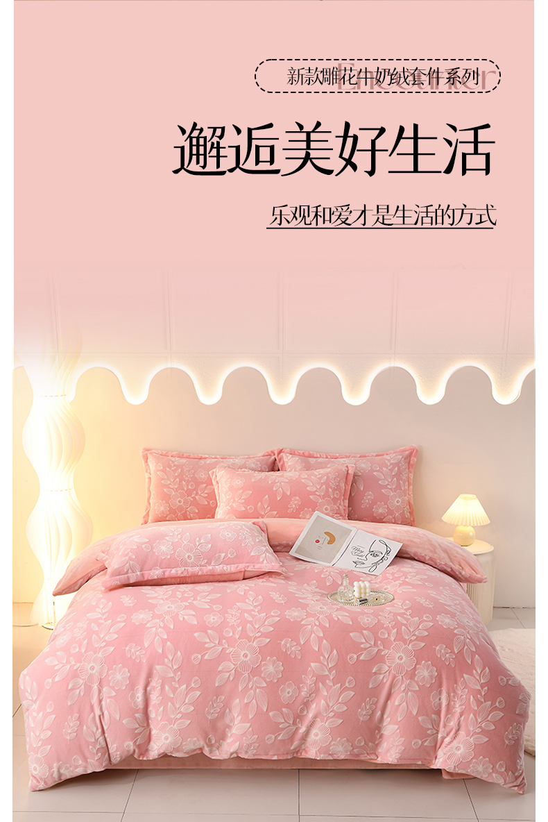 梦之星 25款8斤重牛奶绒6D雕花绒四件套法莱水晶金貂 花甜蜜意-粉