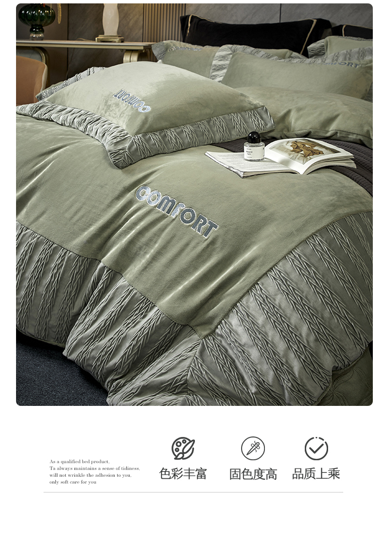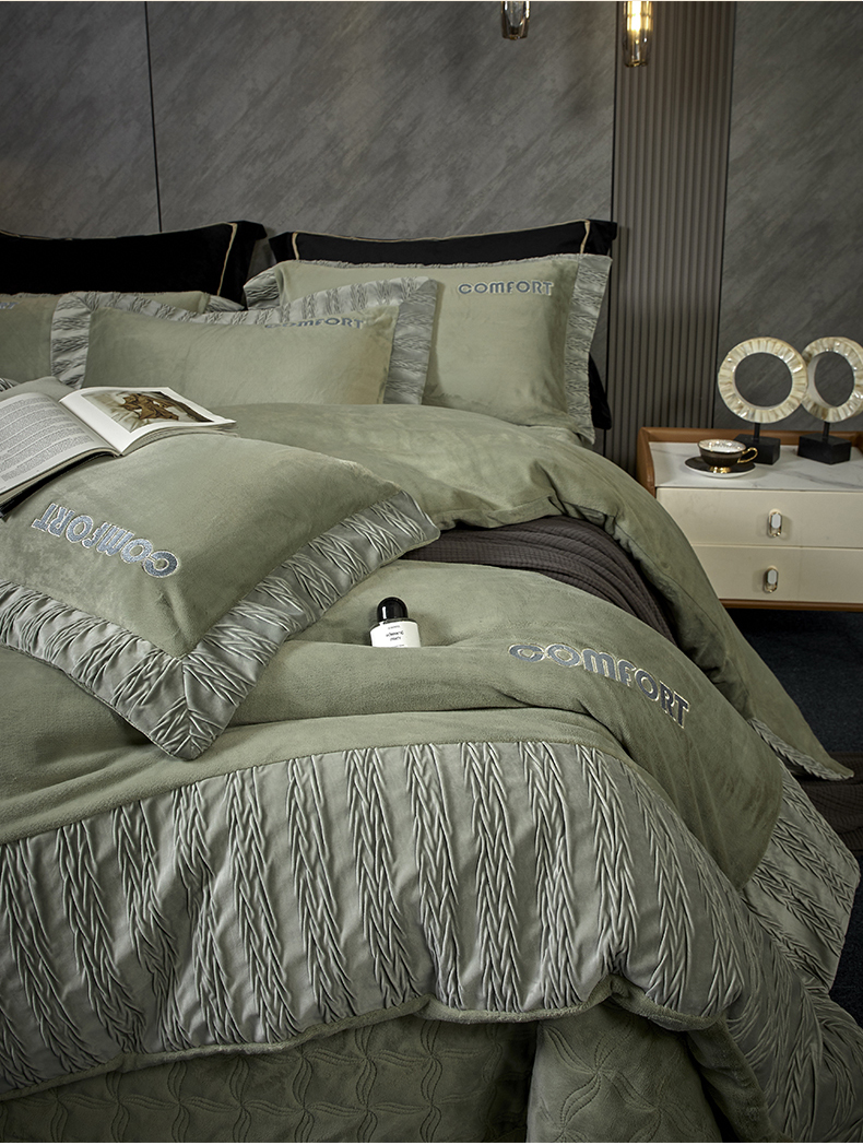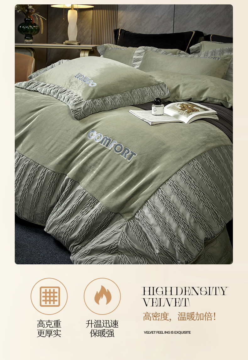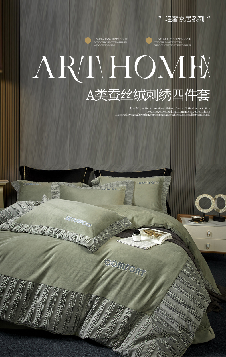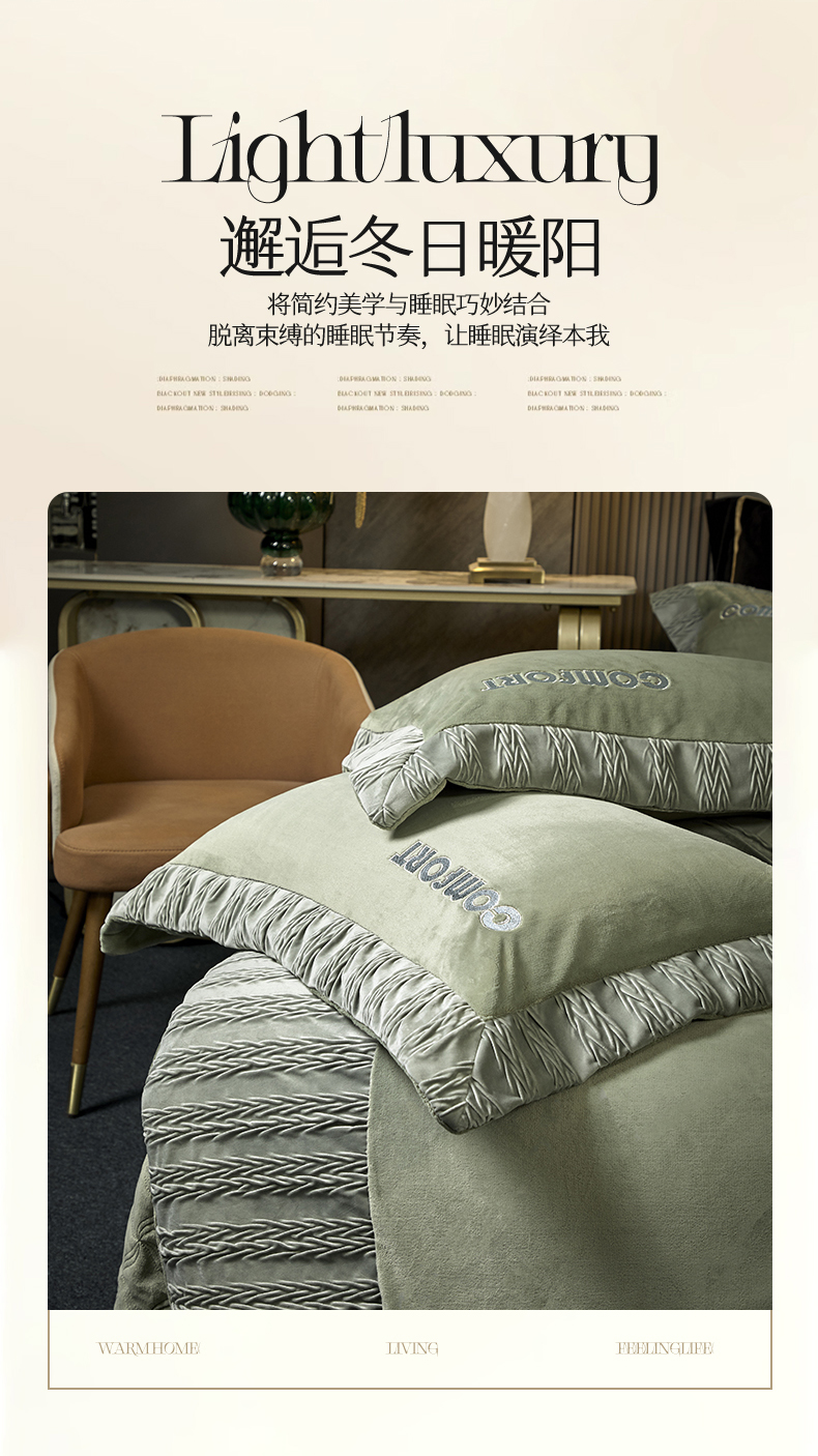商品名称:2024新款高克重牛奶绒刺绣四件套-巴黎印象 巴黎印象-砂绿