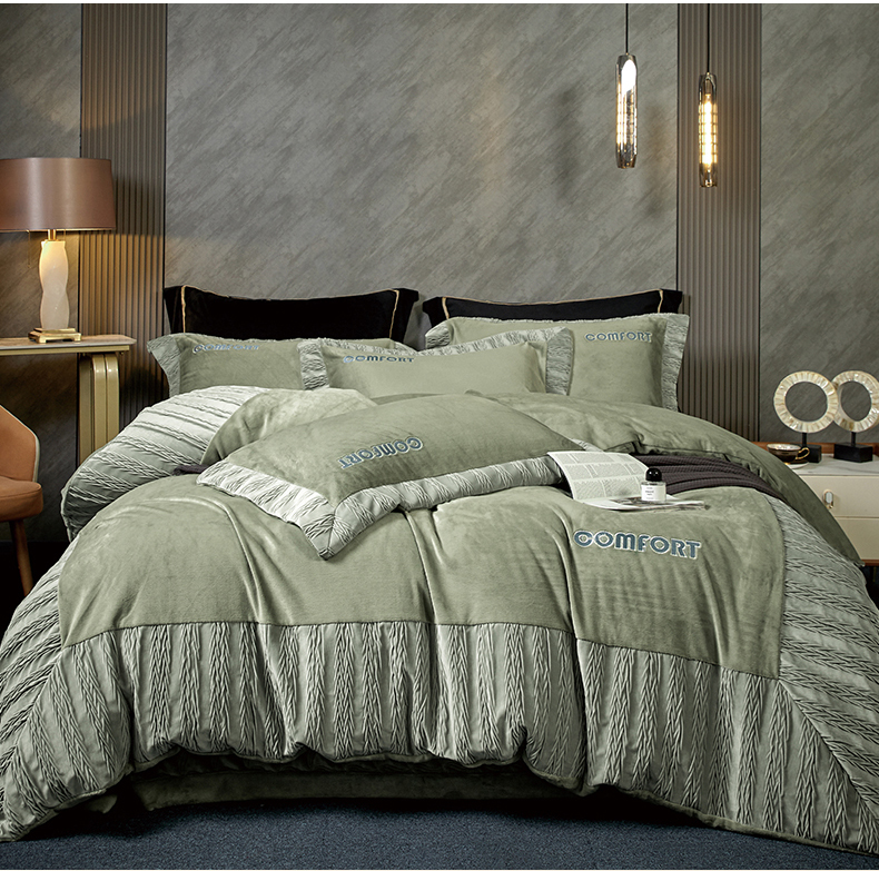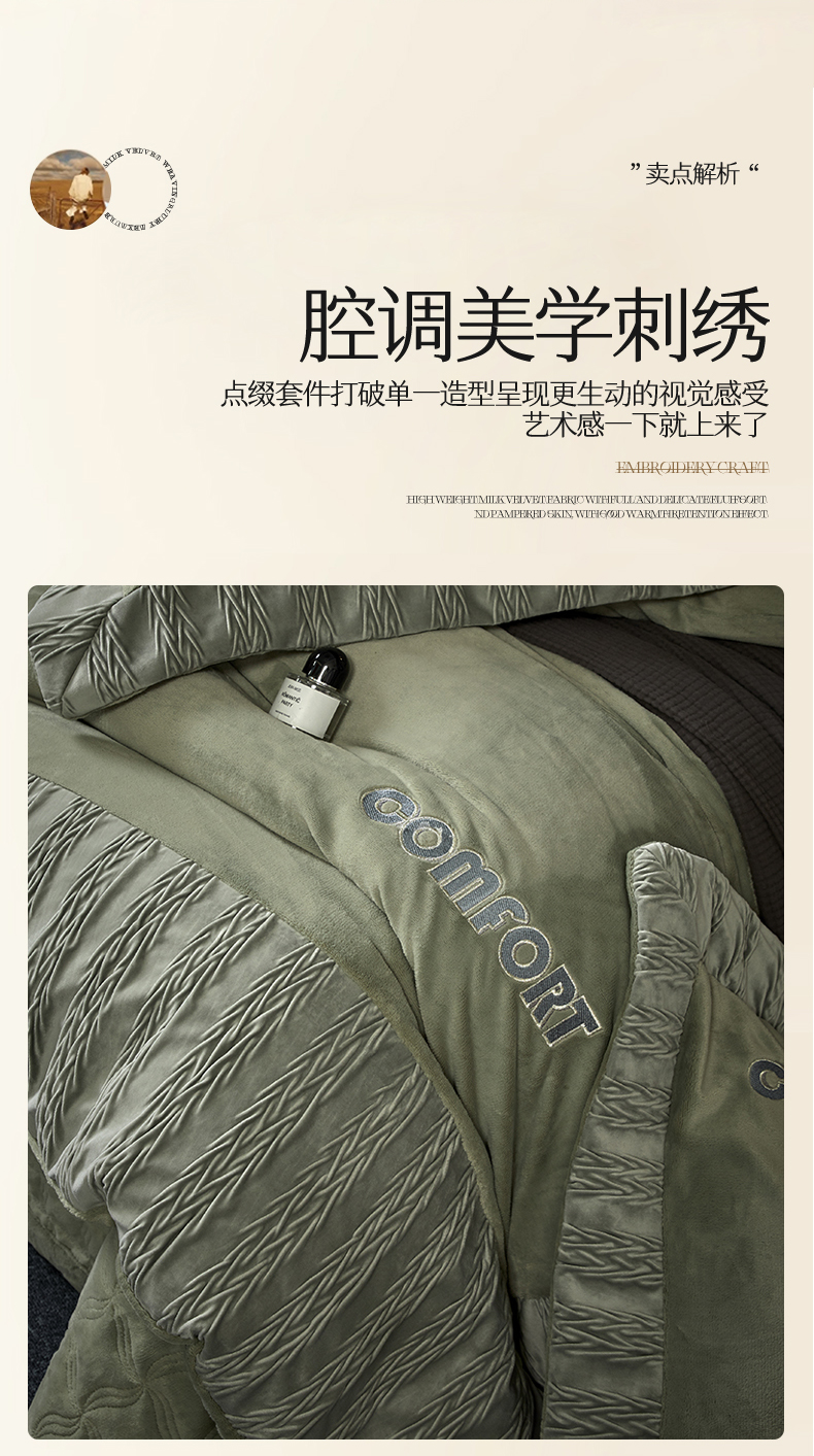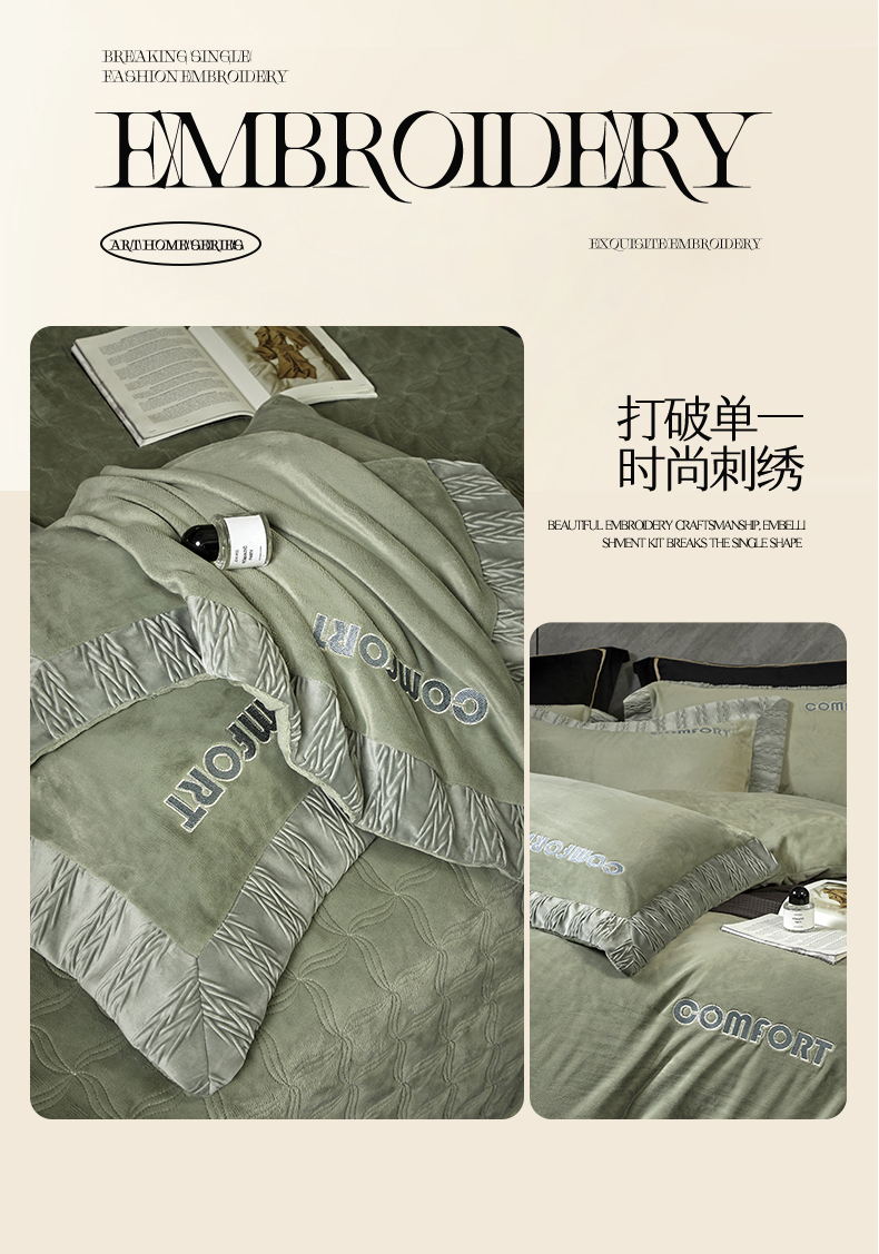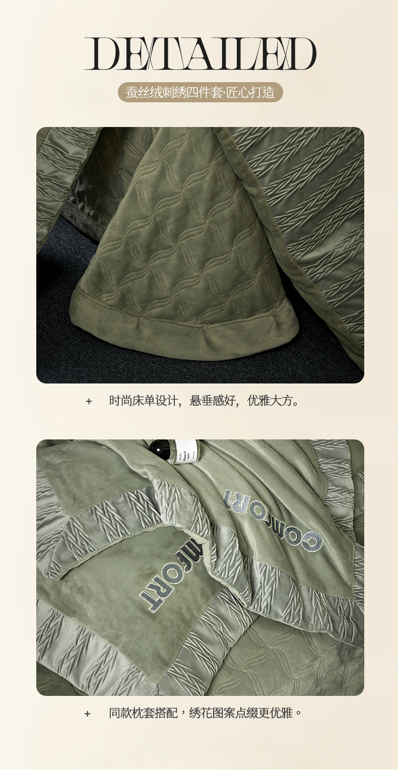 2024新款高克重牛奶绒刺绣四件套-巴黎印象 巴黎印象-砂绿