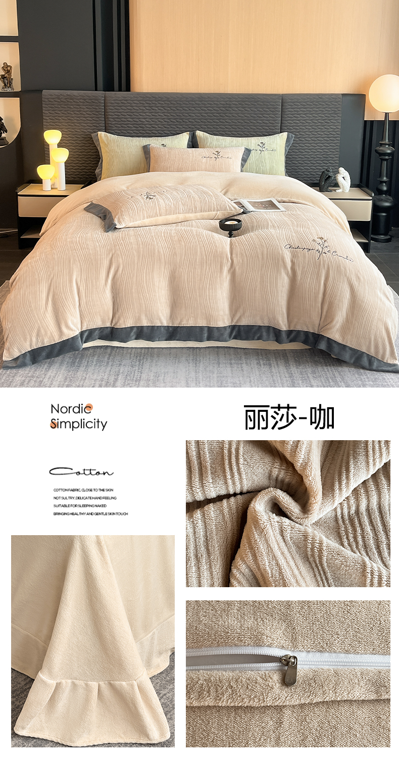子曰 2025新款230g全消光轻奢牛奶绒立体雕花刺绣四件套-丽莎 丽莎-暖咖