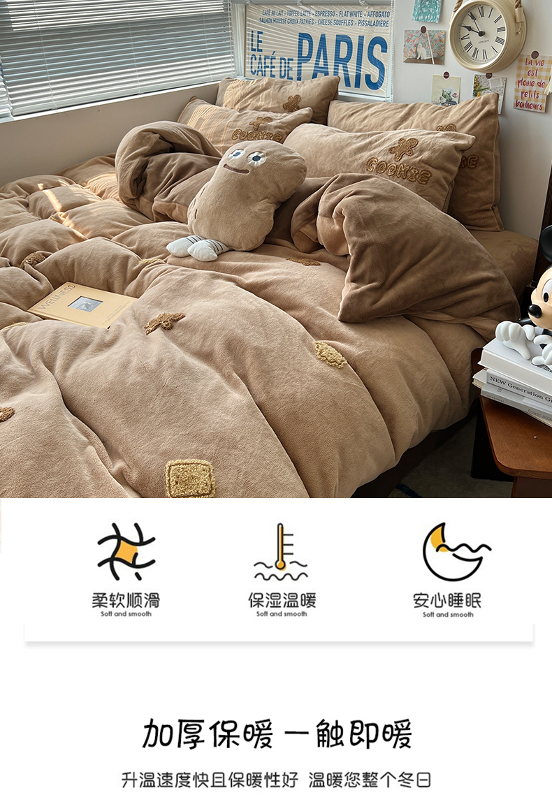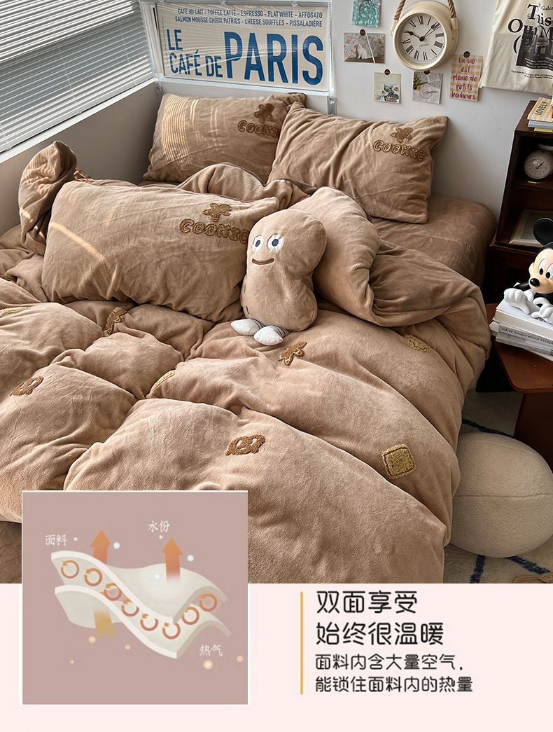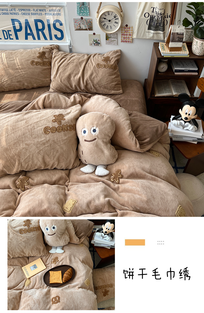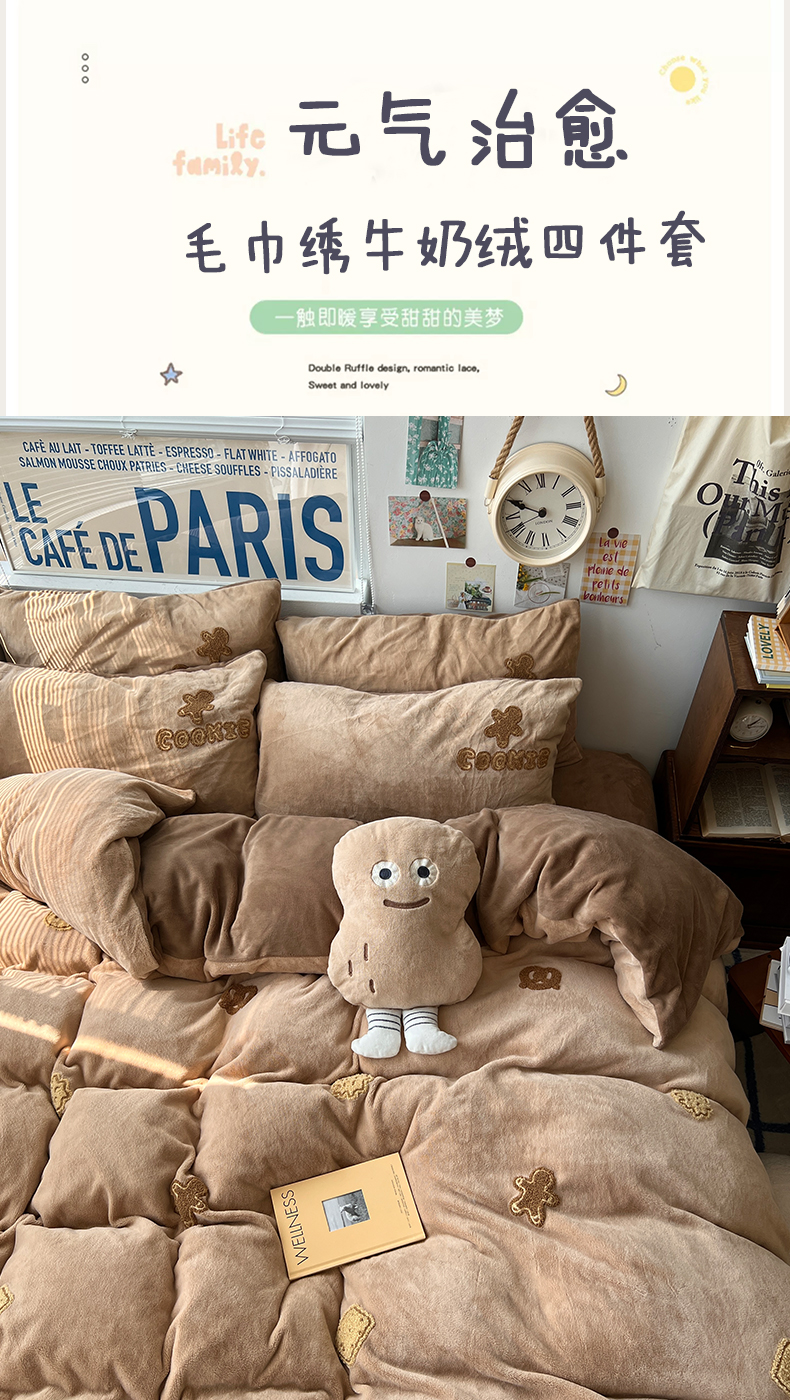 商品名称:原素 2024饼干人毛巾绣牛奶绒四件套 可可巧克力