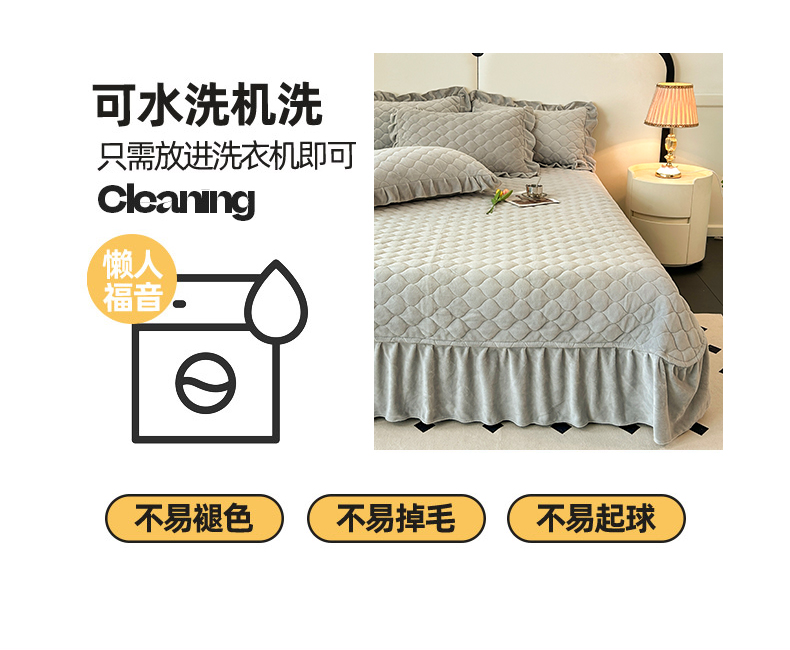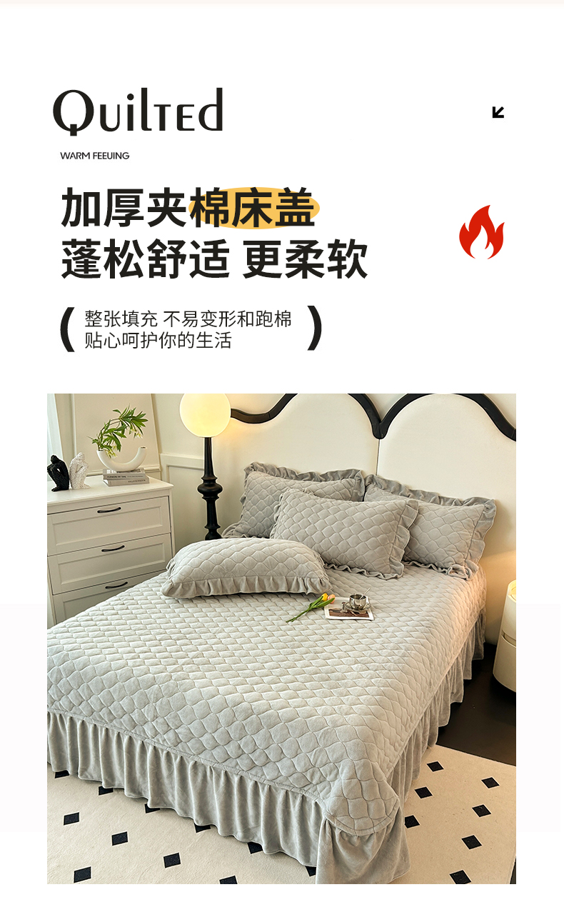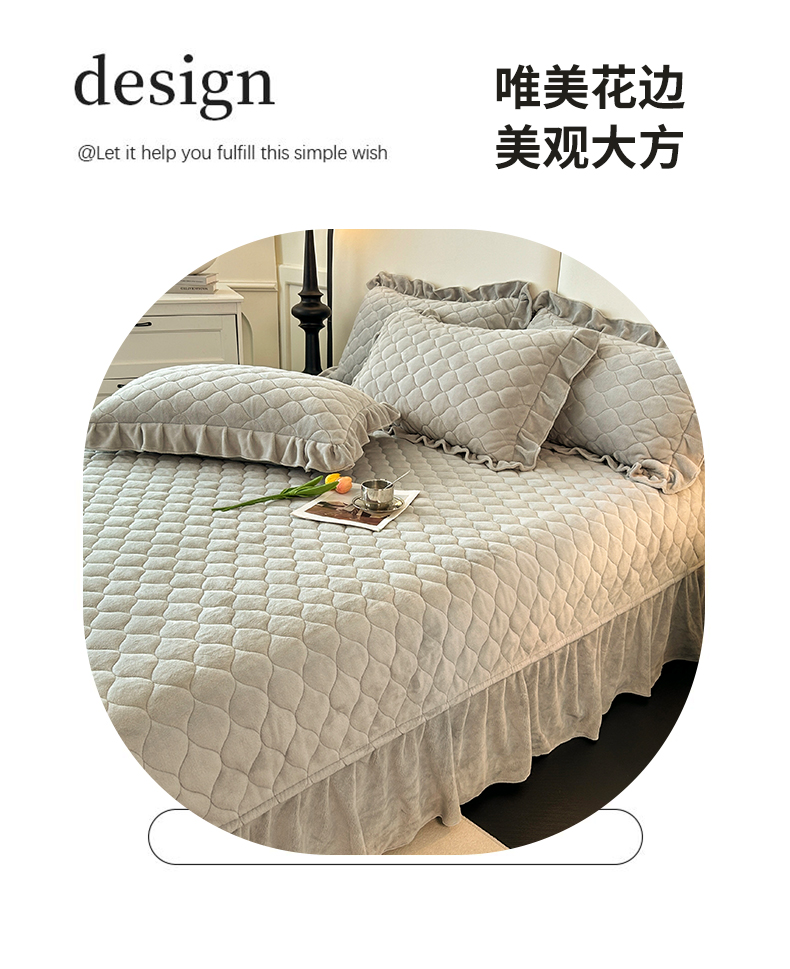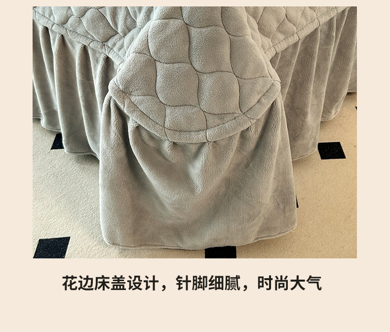 (总)屹成家纺2025新款水晶绒夹棉绗缝蕾丝床裙三件套(塞纳河畔)床裙单件起售价不低于105元,大红,豆沙,翡翠绿,粉玉,橄榄绿,蔚蓝,银灰