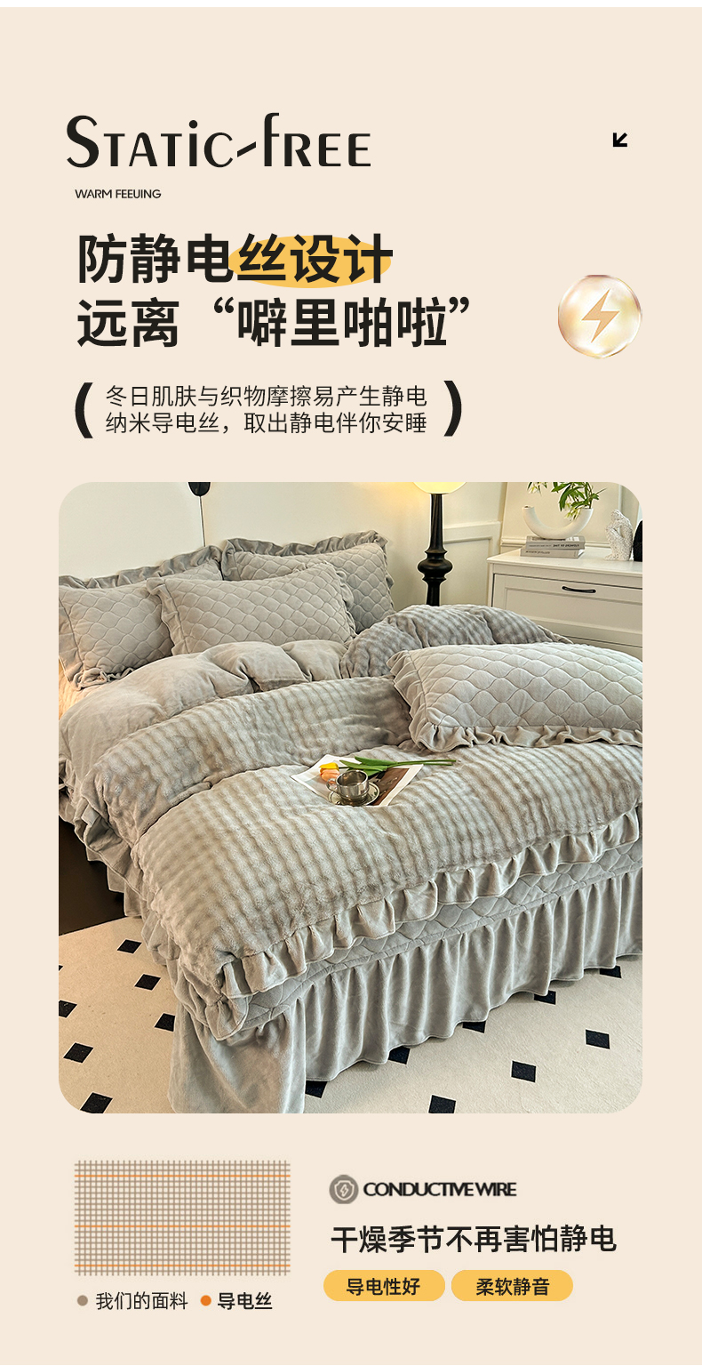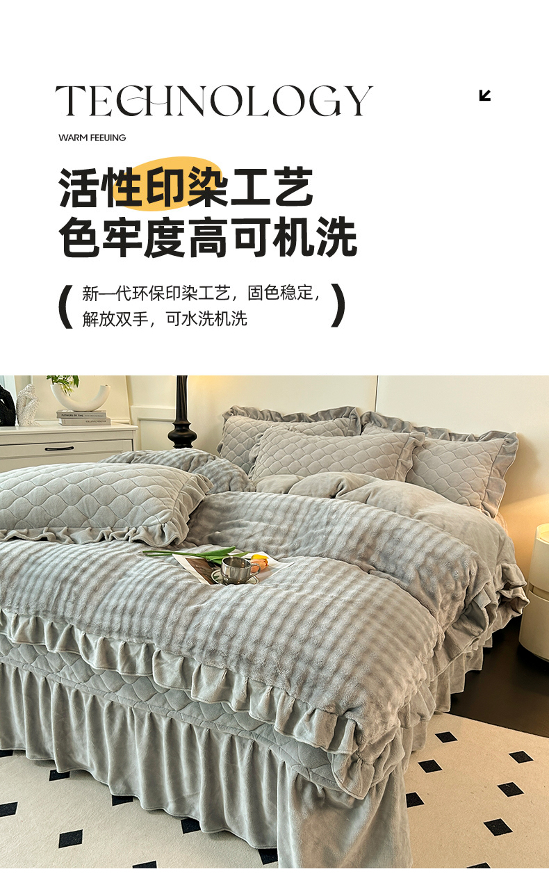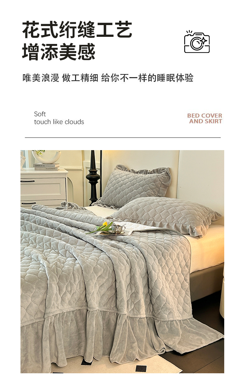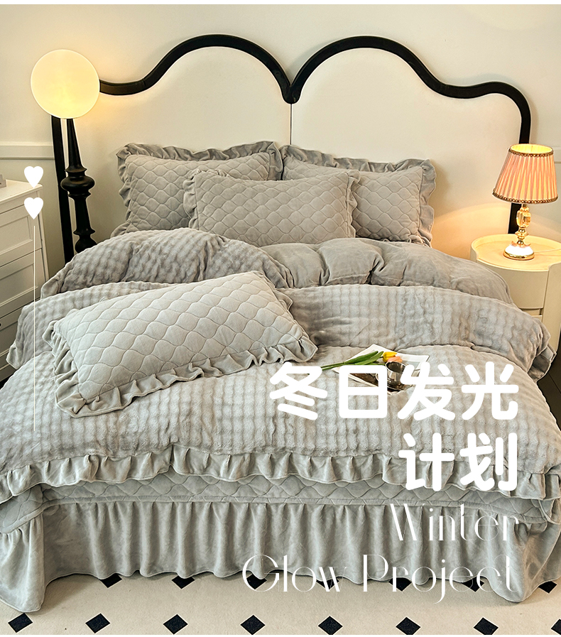 (总)屹成家纺2025新款水晶绒夹棉绗缝床裙四件套(塞纳河畔)四件套起售价不低于230元,大红,豆沙,翡翠绿,粉玉,橄榄绿,蔚蓝,银灰