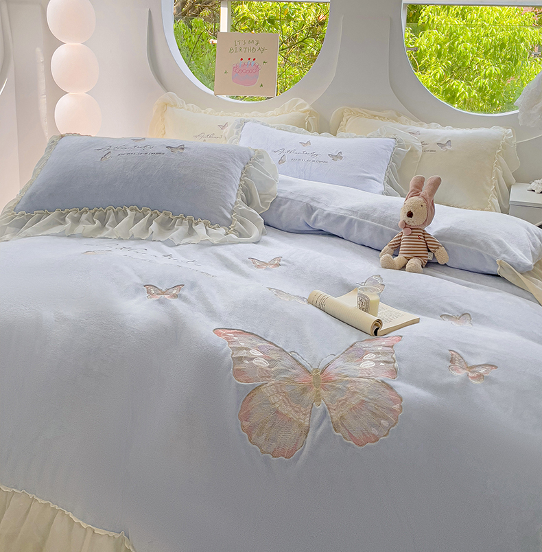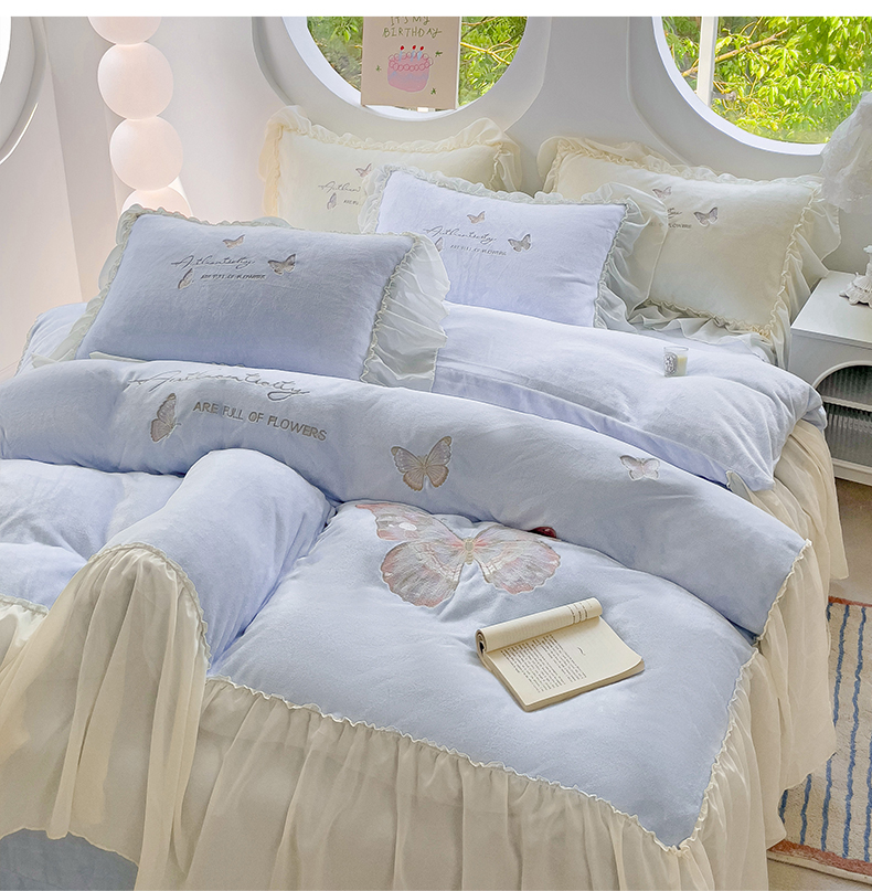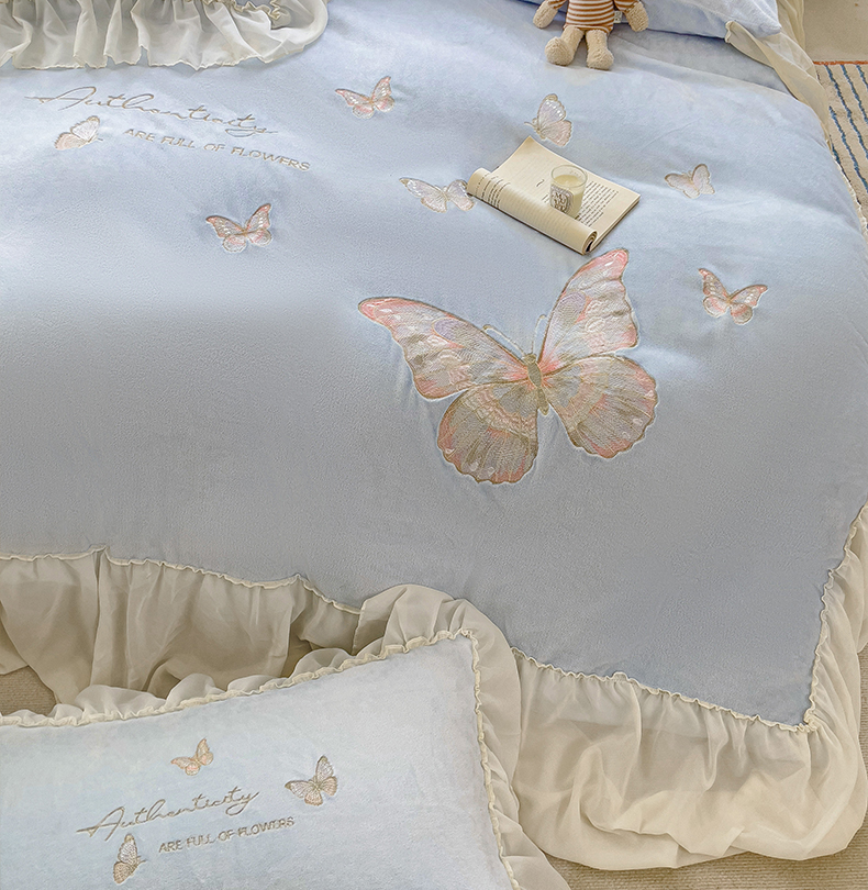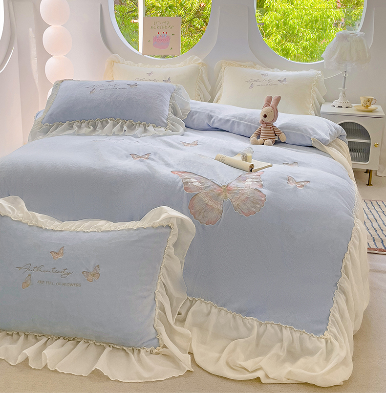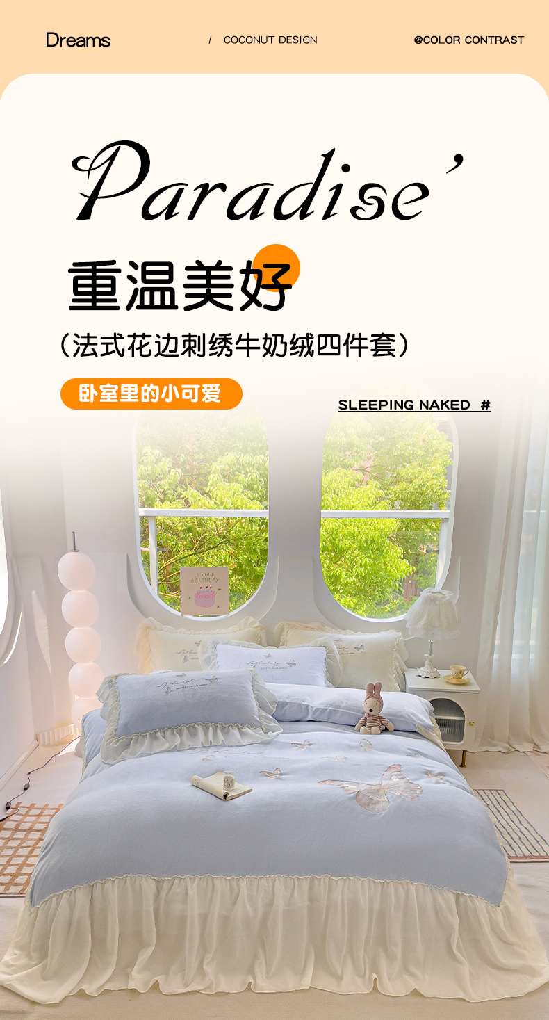 娜娜 2024新款法式花边牛奶绒刺绣四件套-花蕊-花香引蝶系列 花香引蝶-天空蓝