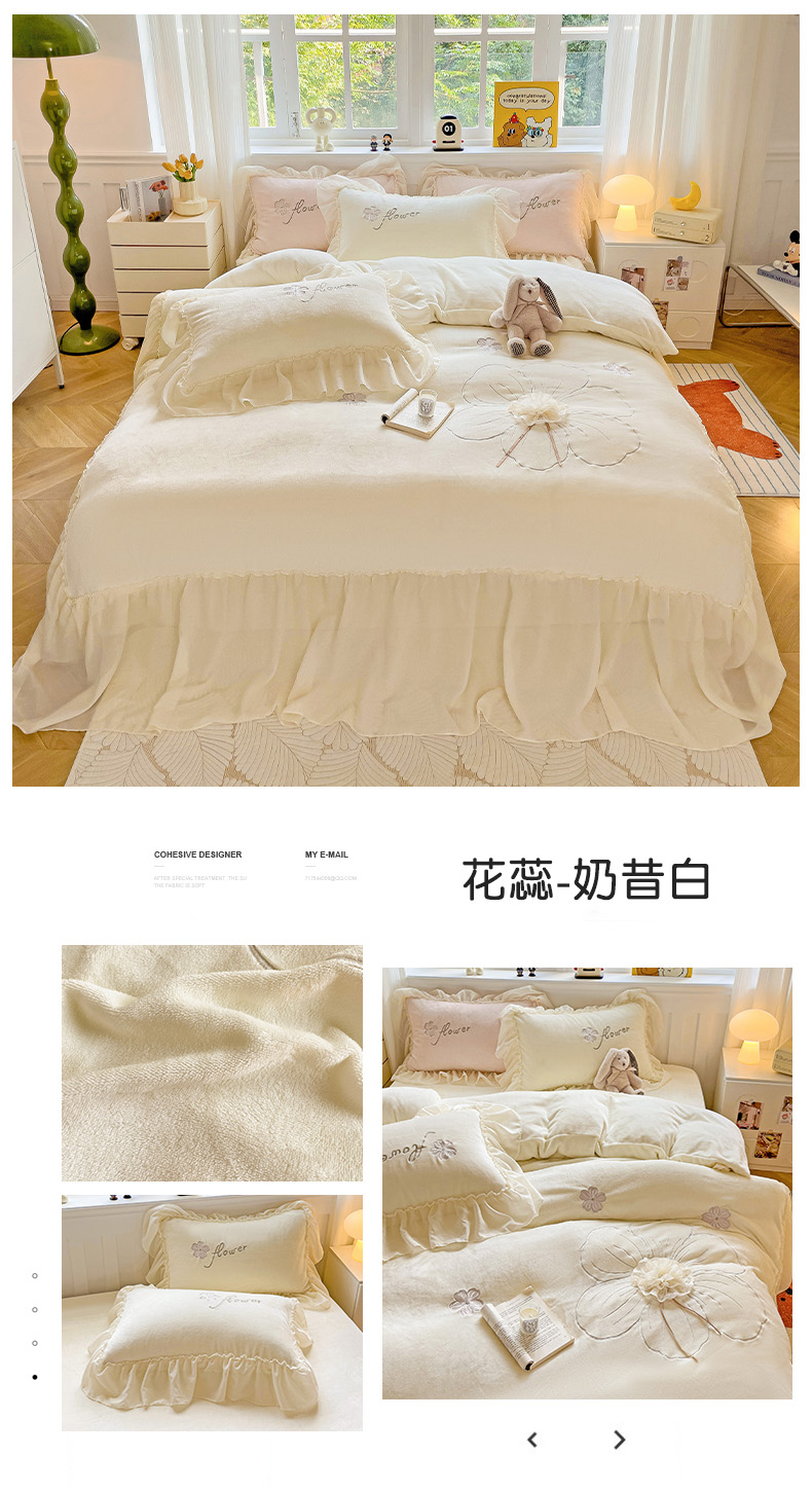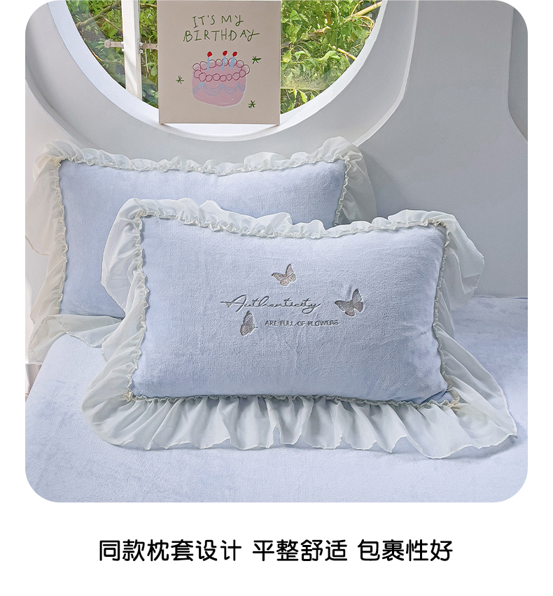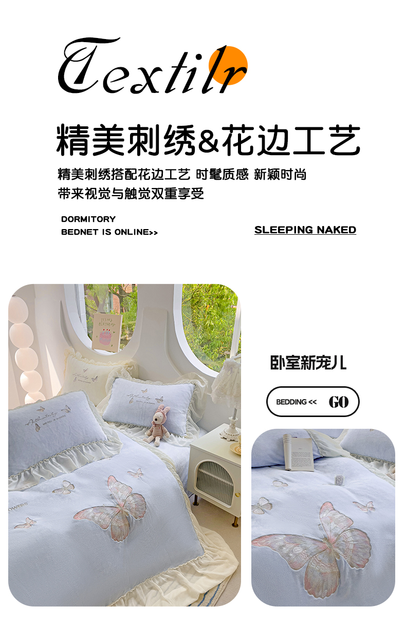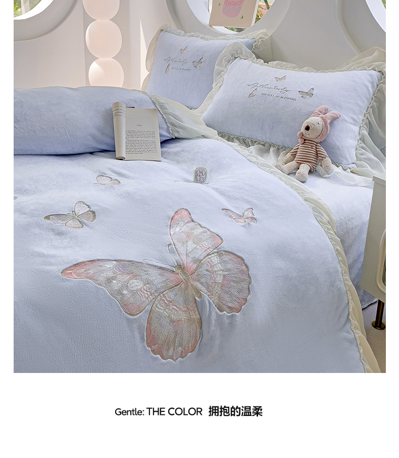 娜娜 2024新款法式花边牛奶绒刺绣四件套-花蕊-花香引蝶系列 花香引蝶-天空蓝