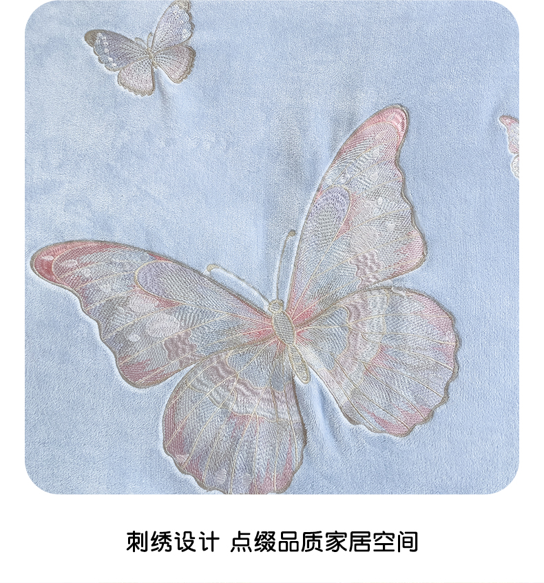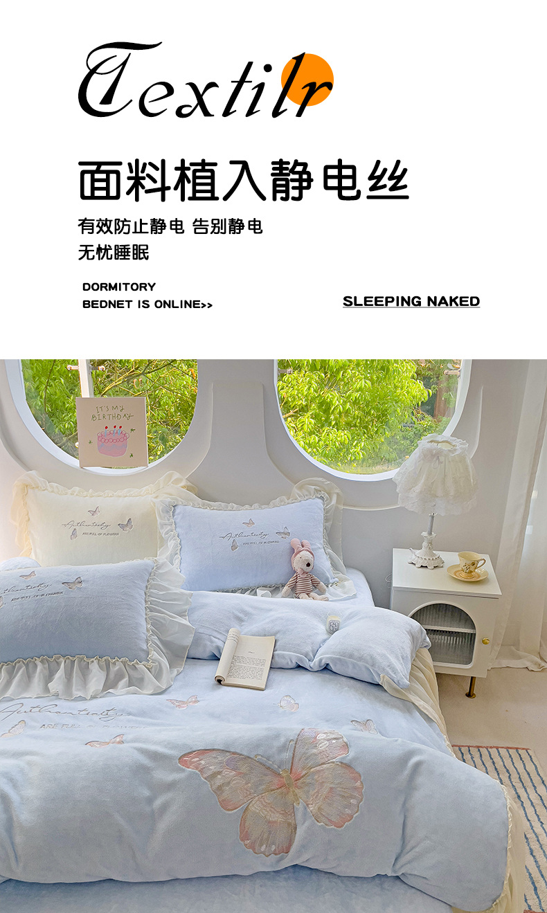 商品名称:娜娜 2024新款法式花边牛奶绒刺绣四件套-花蕊-花香引蝶系列 花香引蝶-天空蓝