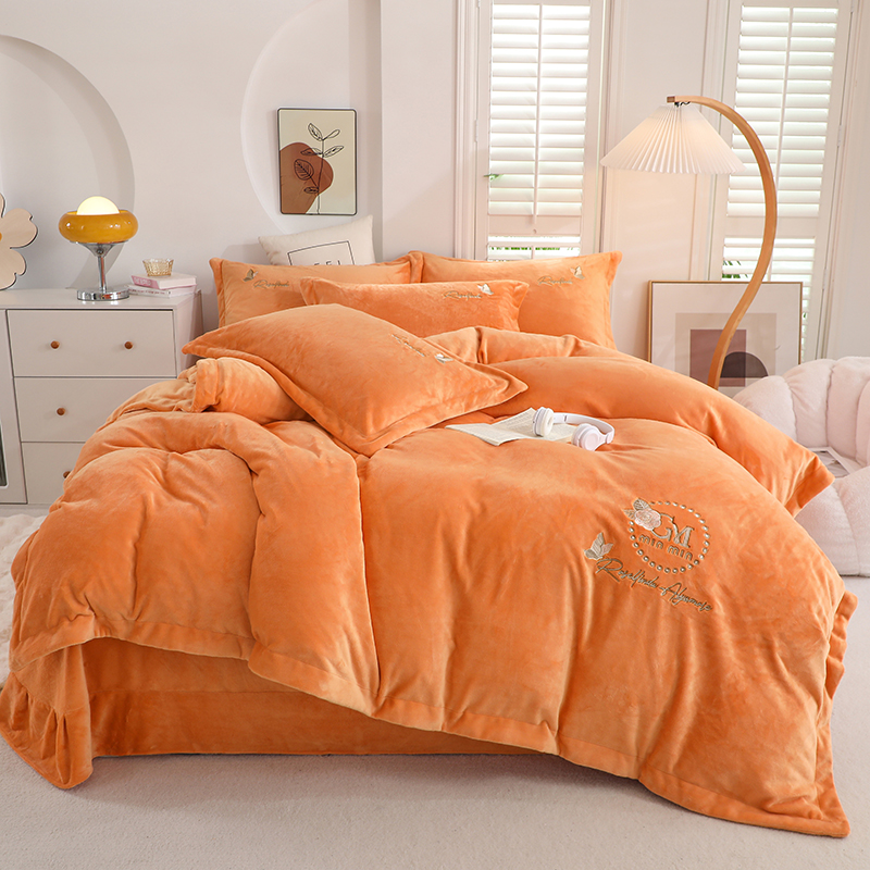 畅畅家纺 2024新款宽边高克重冬季9斤加厚牛奶绒绣花四件套 橙色