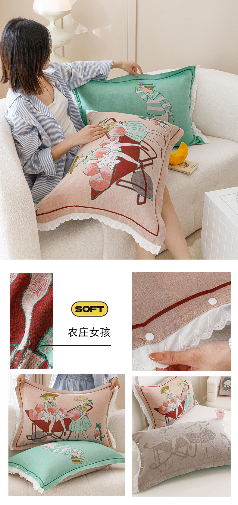 商品名称:2024新款韩系四层纱布枕套一对装花边款纯棉纽扣款枕套 农庄女孩