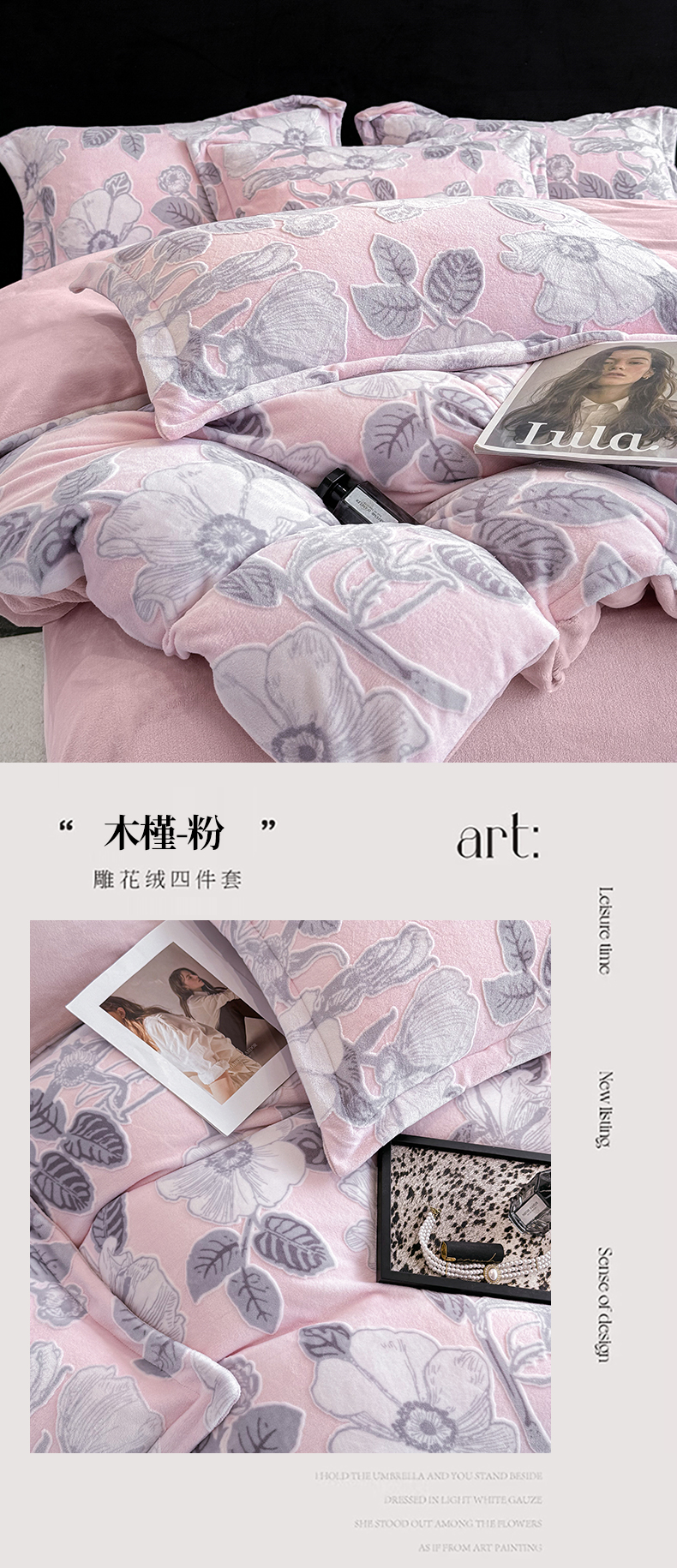 商品名称:金喜 2024新款加厚保暖230克高克重牛奶绒四件套雕花绒四件套-牛奶绒雕花系列 木槿-粉