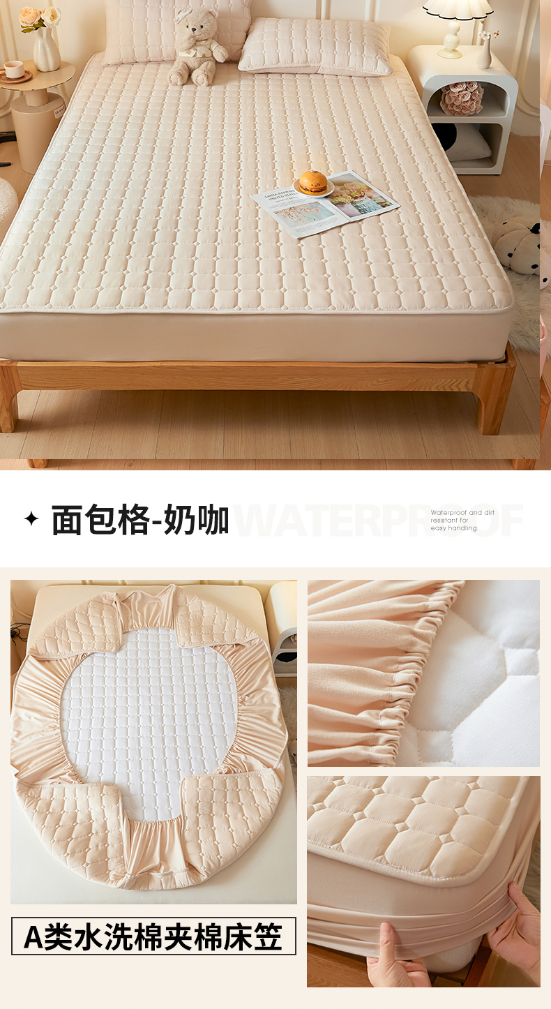 九亭家纺 2025新款A类水洗棉夹棉防水床笠 面包格-奶咖