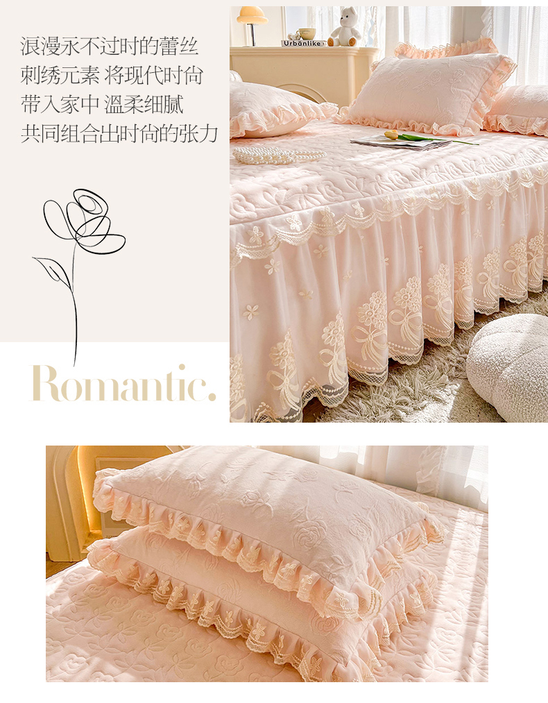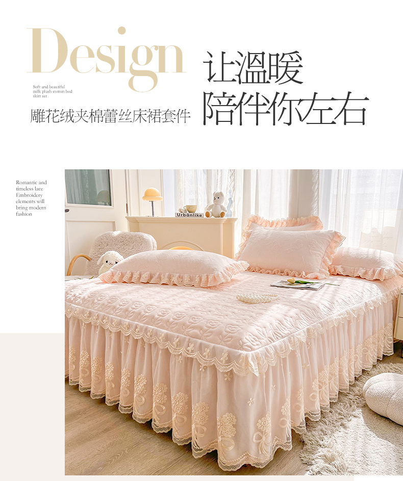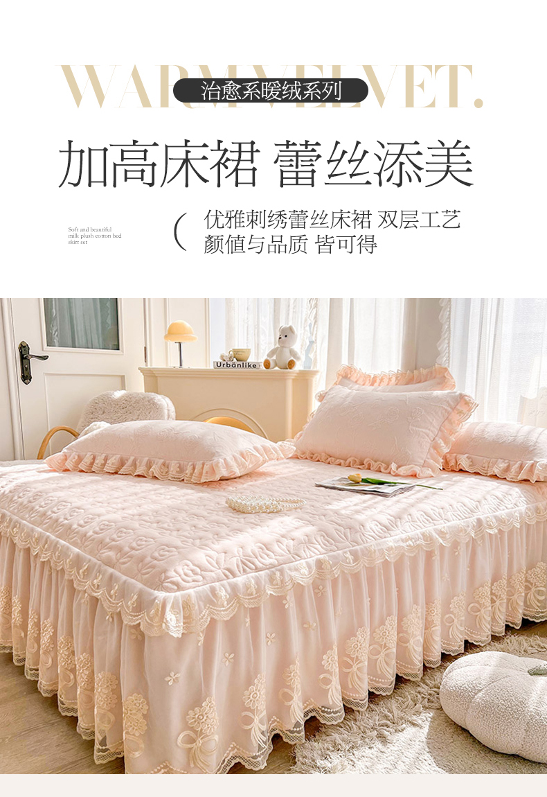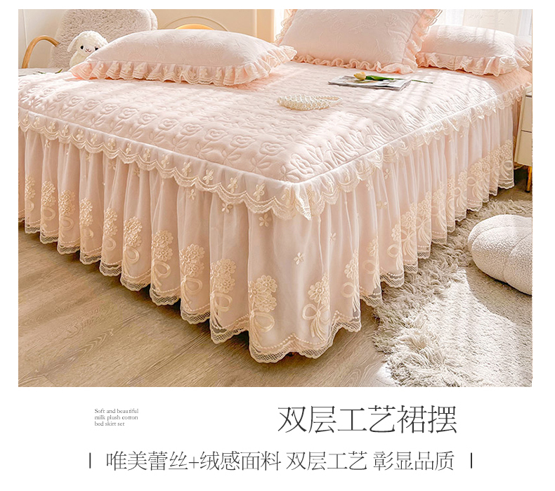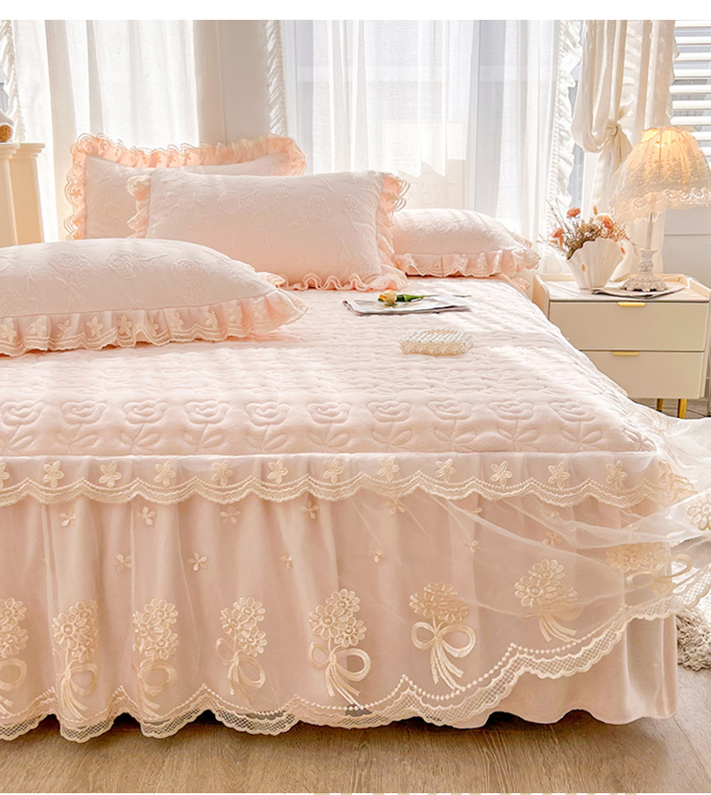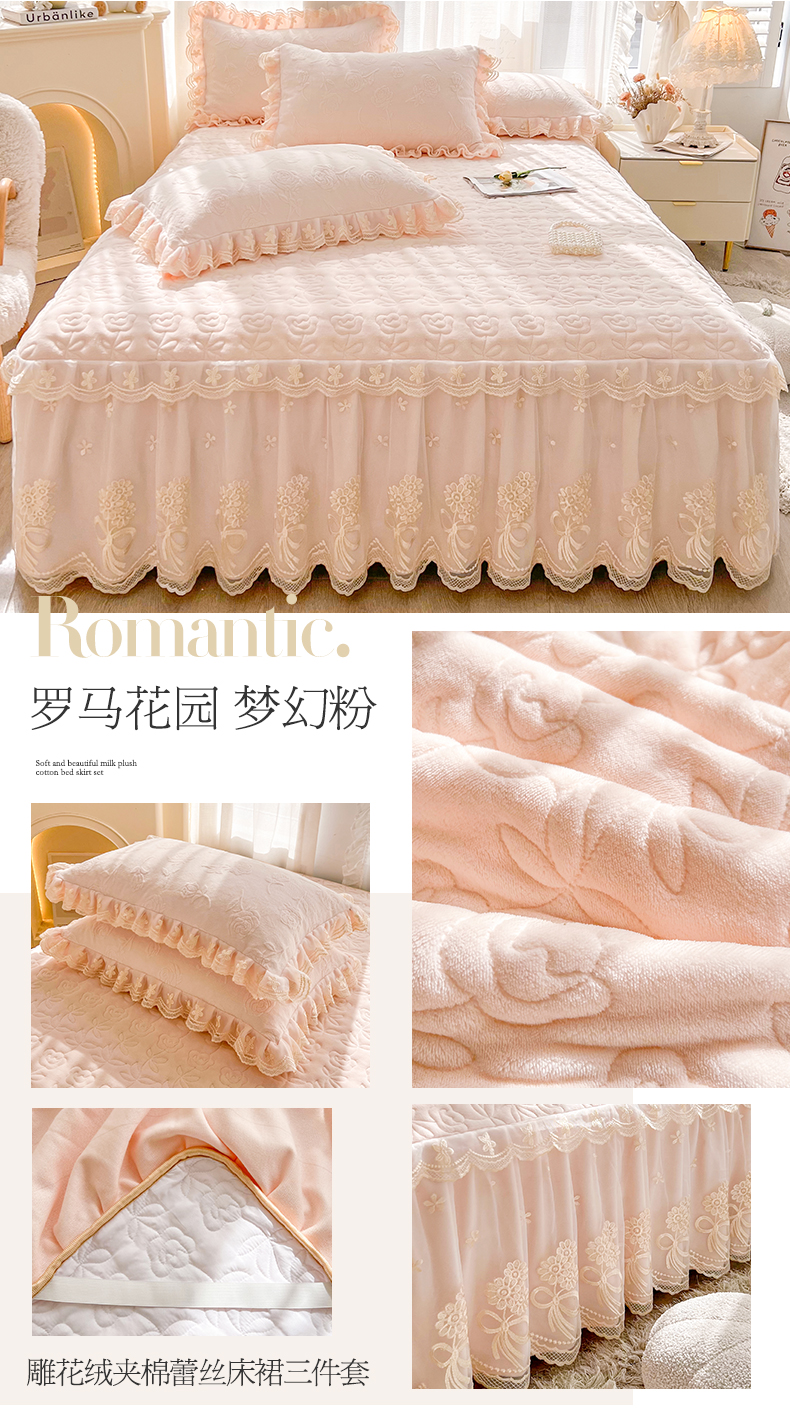 虹星家纺 2024新款雕花夹棉蕾丝牛奶绒床裙-罗马花园 罗马花园 梦幻粉