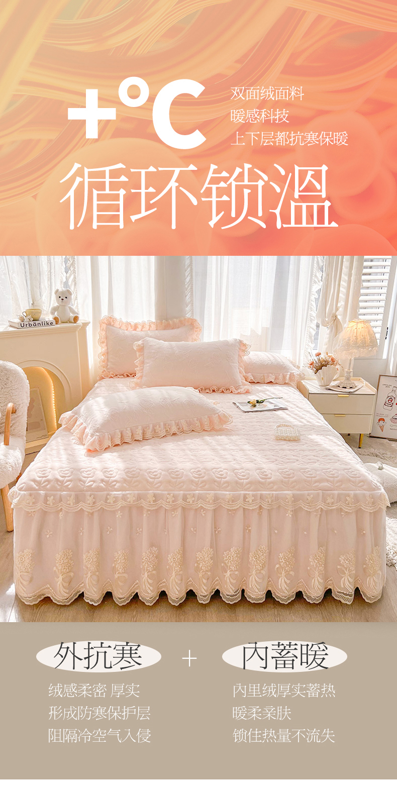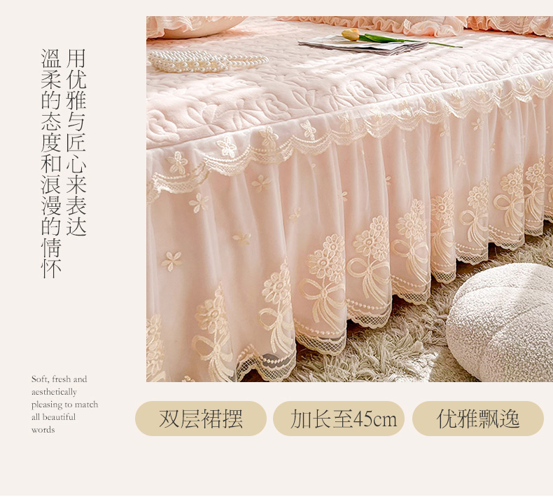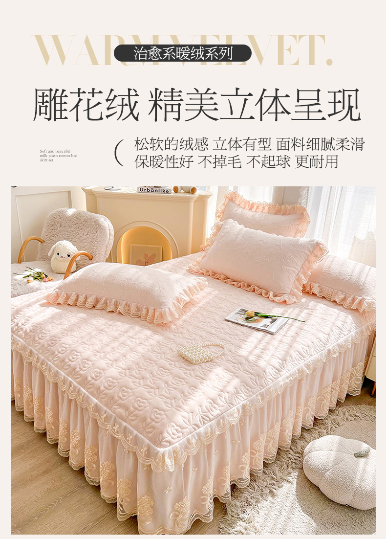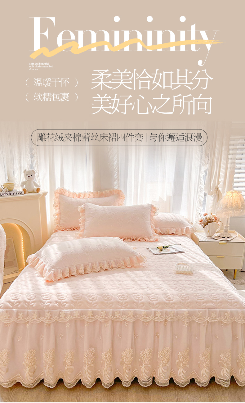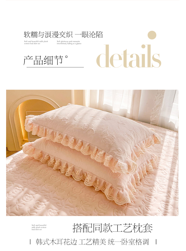 虹星家纺 2024新款雕花夹棉蕾丝牛奶绒床裙-罗马花园 罗马花园 梦幻粉