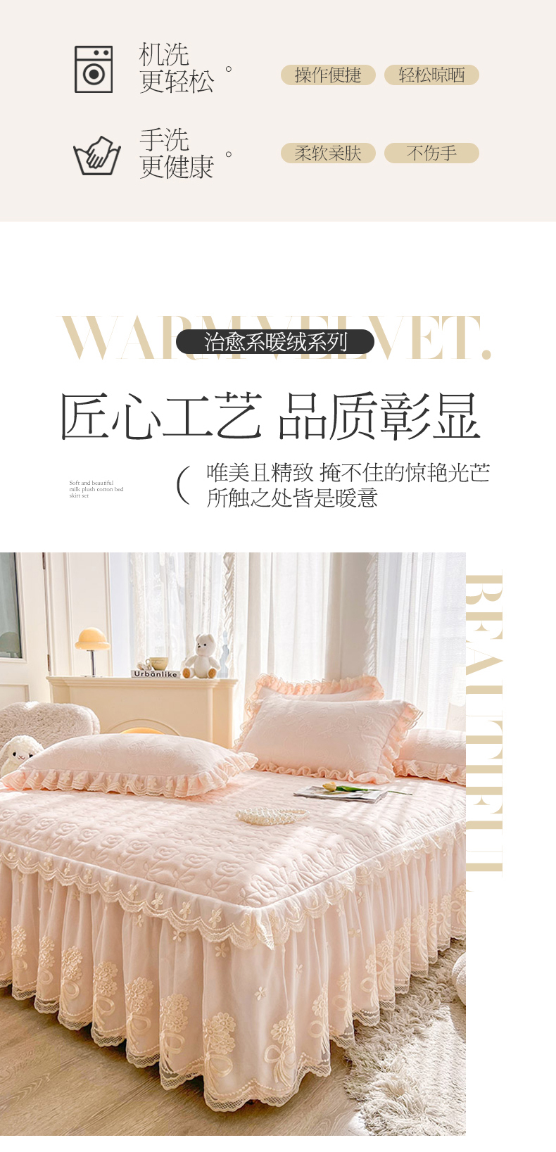 (总)虹星家纺 2025新款雕花牛奶绒床裙三件套-花溪系列,花溪-米黄,花溪-奶油黄
