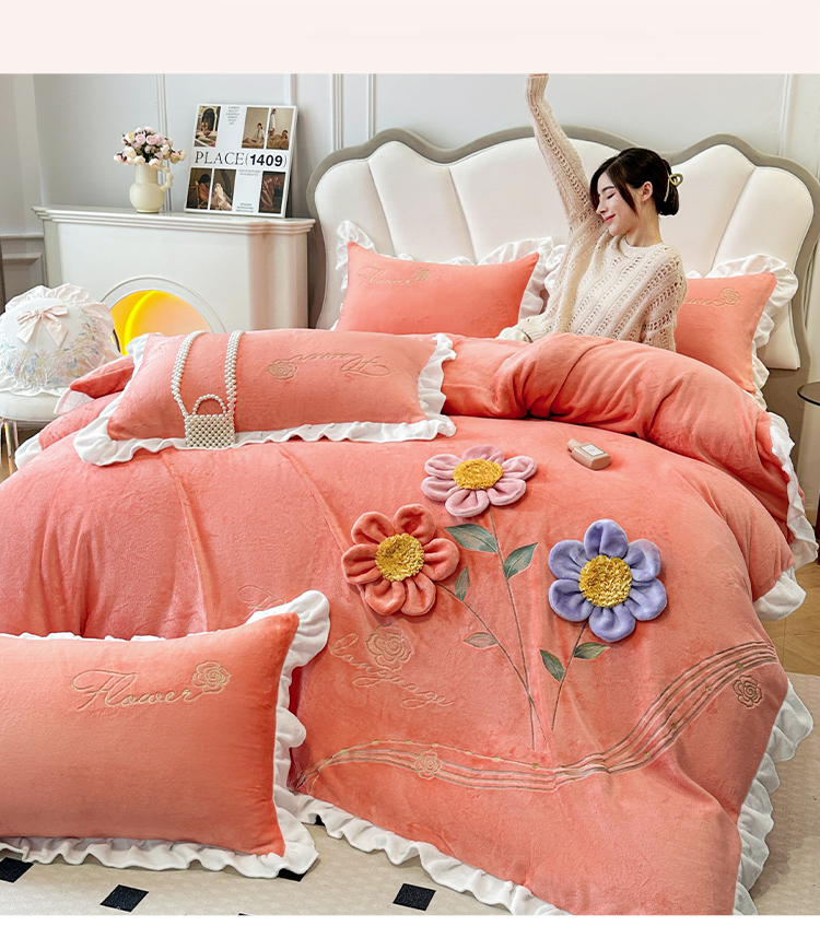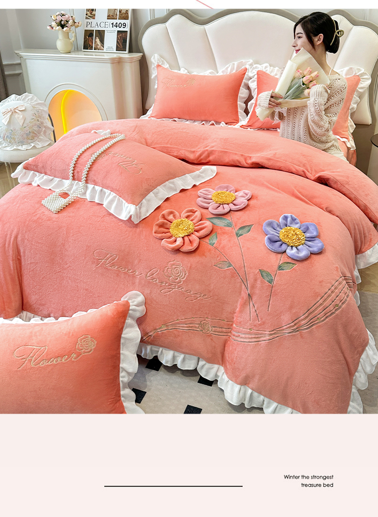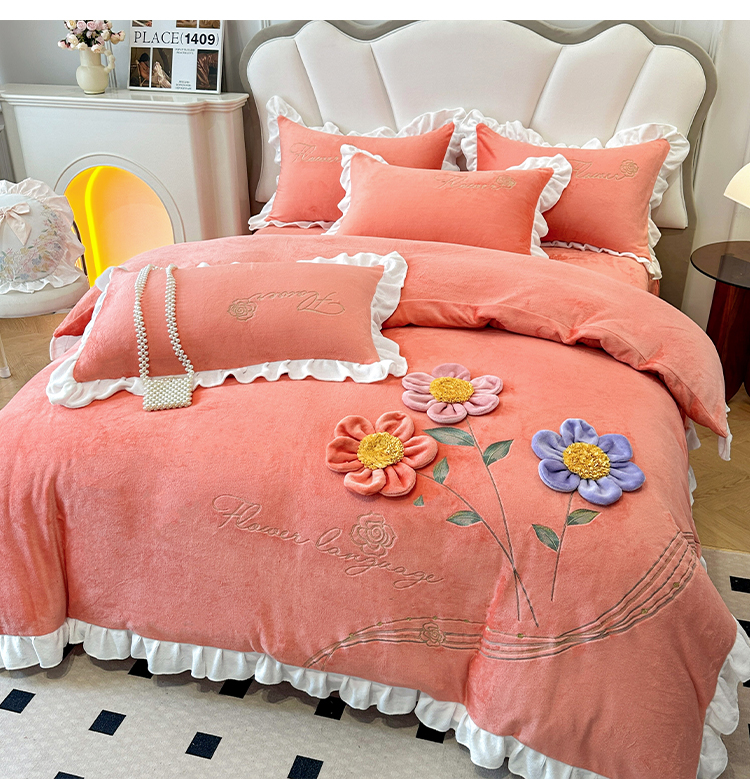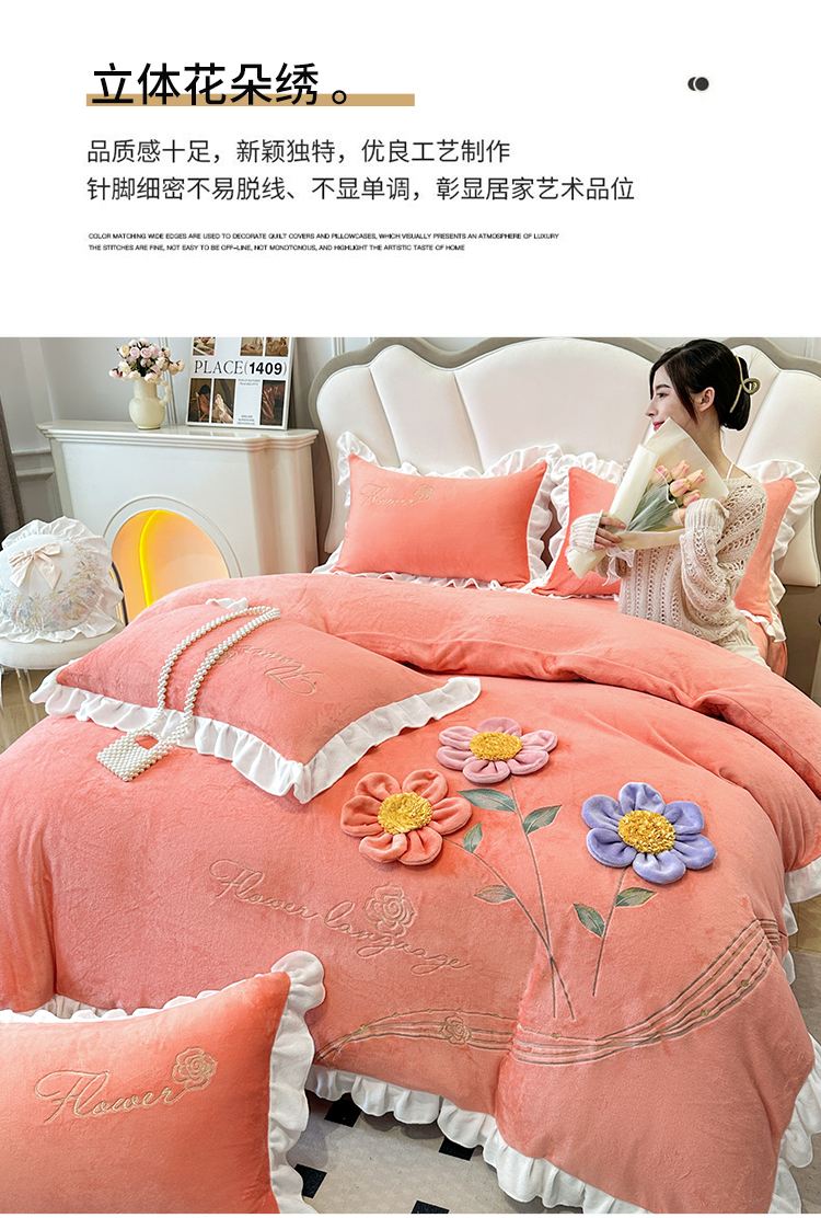 9斤高端韩版少女心法式公主风贴布绣花牛奶绒四件套小清新绒兔毛绒法莱绒床盖被套丝绒兔毛绒法莱绒床盖被套 锦上添花-艾玛橙