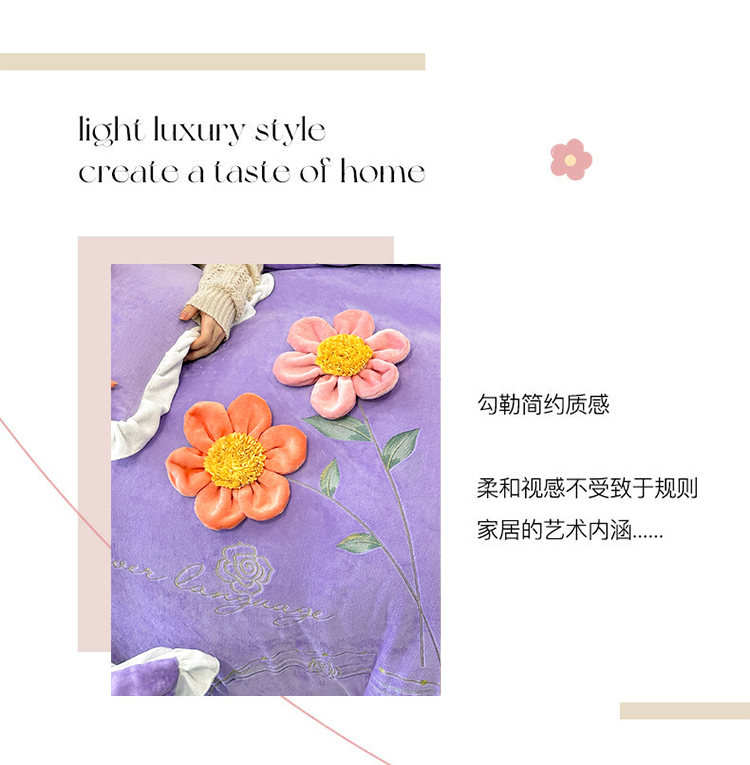 商品名称:9斤高端韩版少女心法式公主风贴布绣花牛奶绒四件套小清新绒兔毛绒法莱绒床盖被套丝绒兔毛绒法莱绒床盖被套 潘多拉—梦幻紫