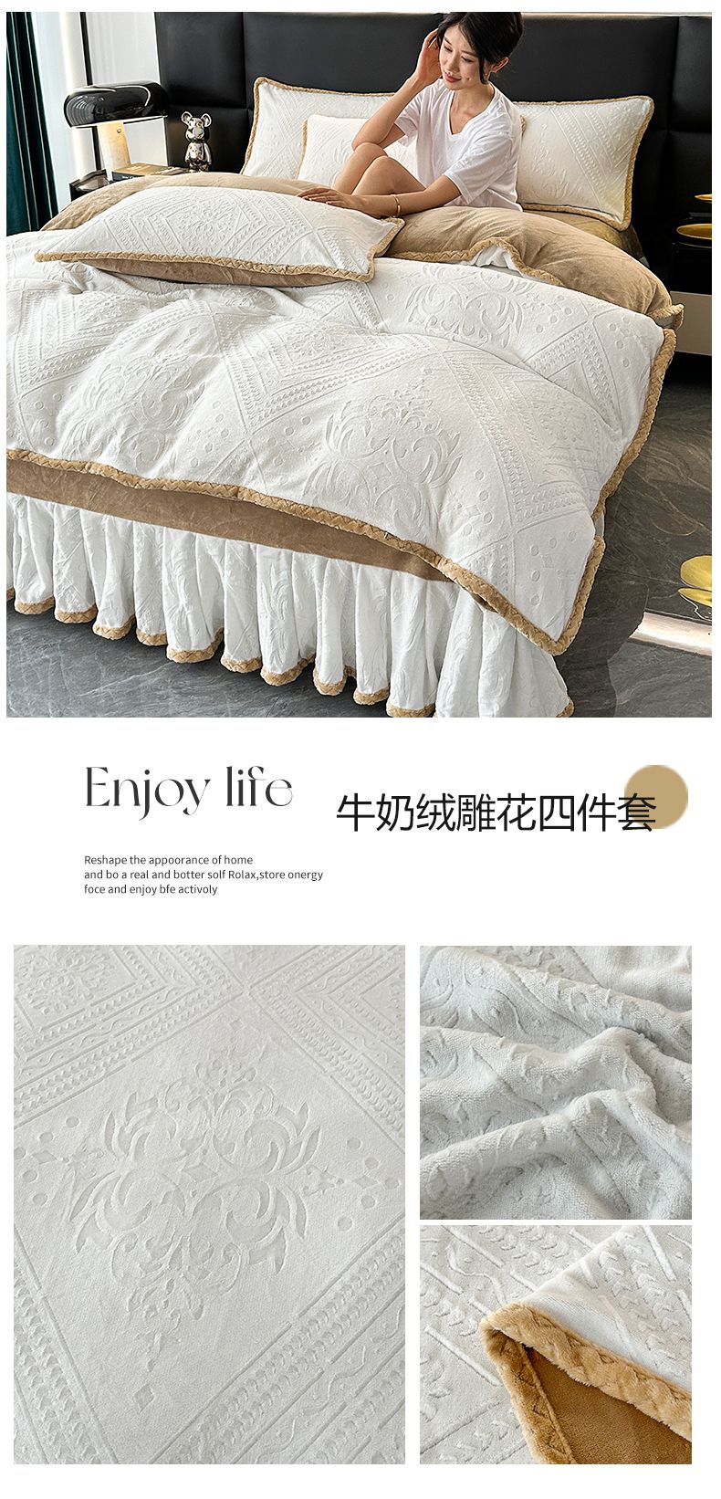 (买家秀爆款不断货)A类母婴级8D牛奶雕花绒四件套珊瑚绒四件套雪花绒四件套花卉雕花牛奶绒四件套北欧风 欧式情怀-珍珠白