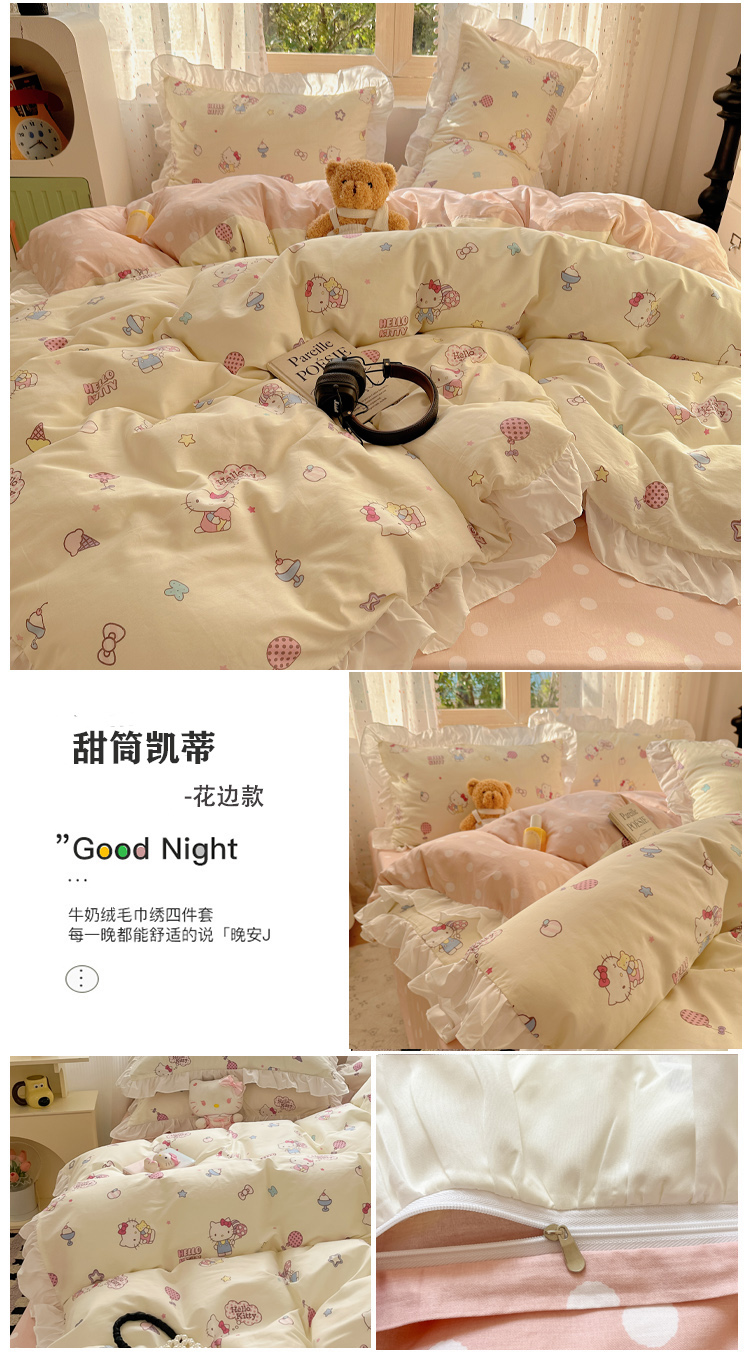 (总)三朵家纺 2024新款牛奶绒绣花四件套三丽鸥系列,草莓公主KT,梦幻旅行,逃学帕恰,淘气宝贝,甜心搬运工,香香公主KT,樱桃美乐蒂