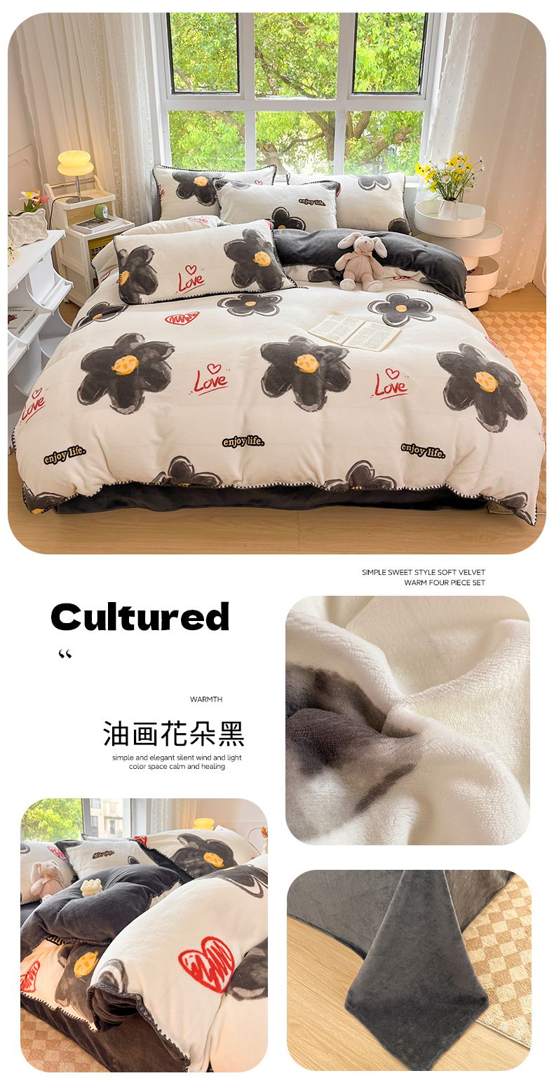 当前位置: 91家纺网 > 商品网购 > 床品套件 > 四件套 > 牛奶绒四件套 > (买家秀 爆款不断货)A类母婴级双面牛奶绒四件套三角针珊瑚绒雪花绒四件套高克重卡通牛奶绒四件套花卉 油画花朵黑