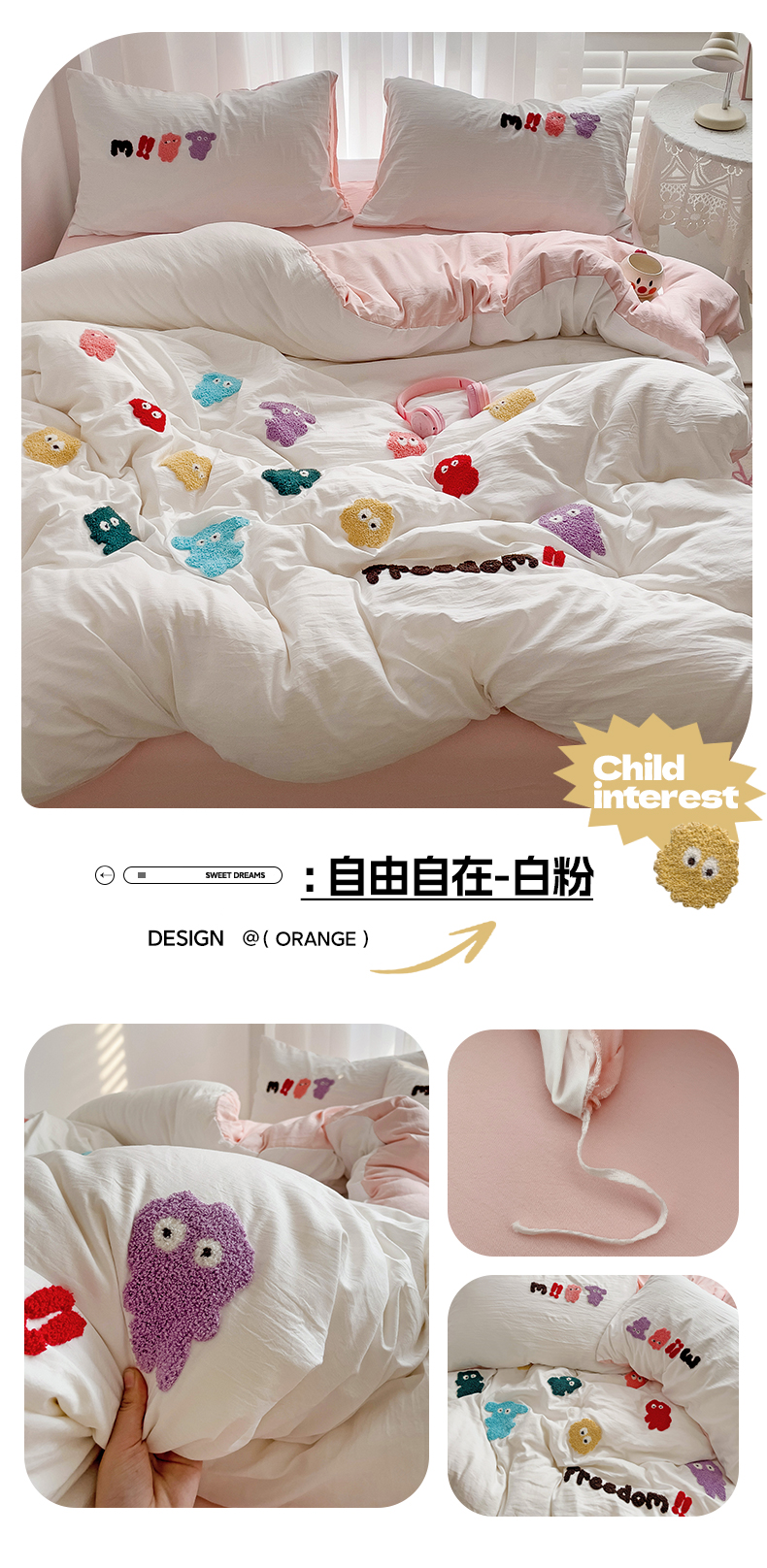 当前位置: 91家纺网 > 商品网购 > 床品套件 > 四件套 > 水洗棉四件套 > 花伞家居 2025新款可爱毛巾绣水洗棉四件套-自由自在(提供买家秀) 自由自在-白粉
