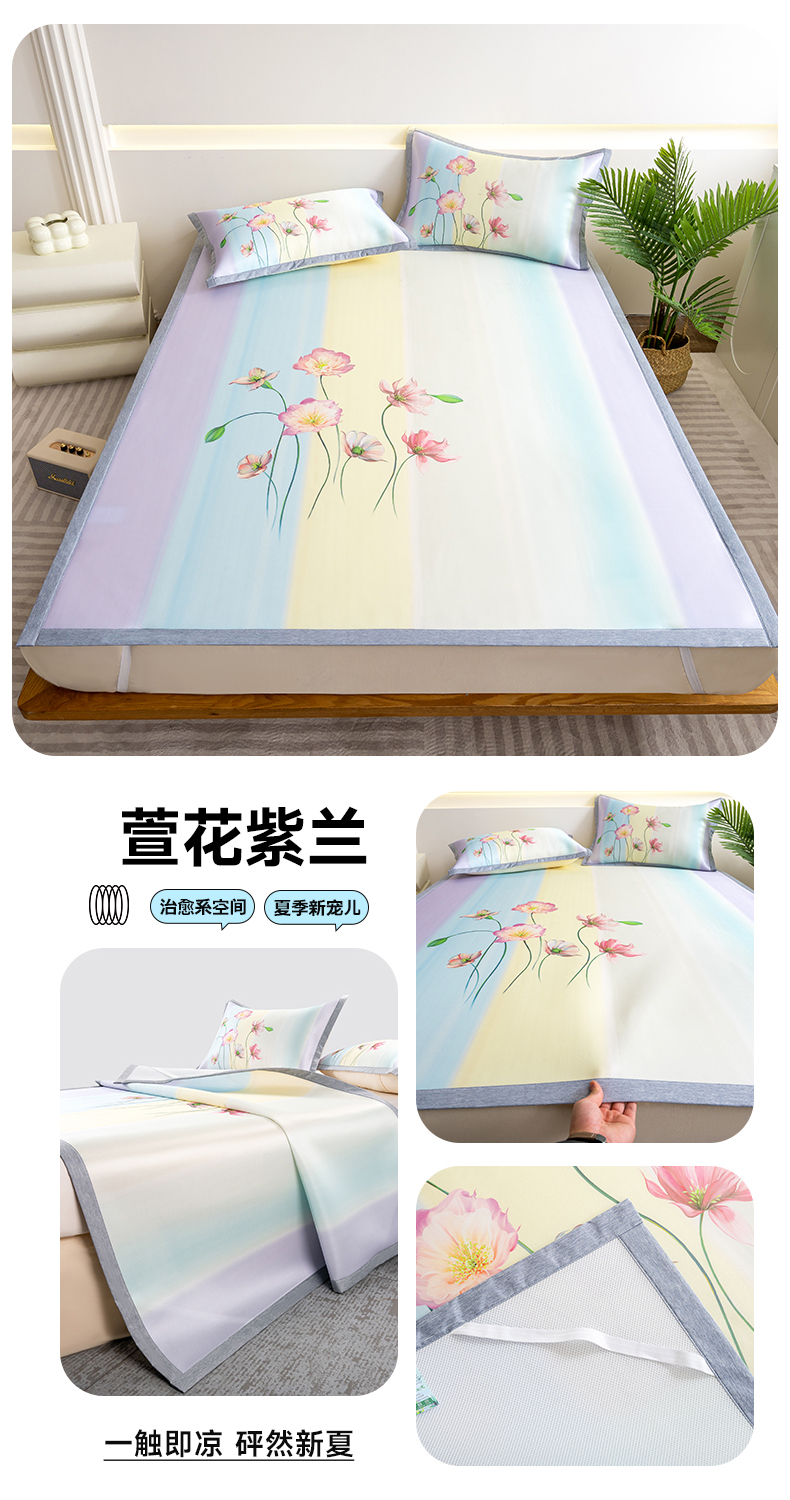 商品名称:邵依家纺 2025新款数码印花烫光冰丝席凉席子藤席场景二 萱花紫兰
