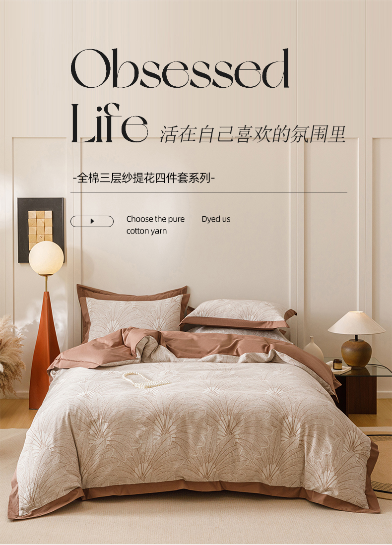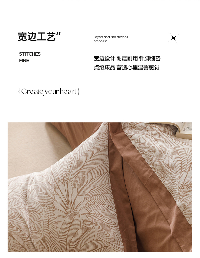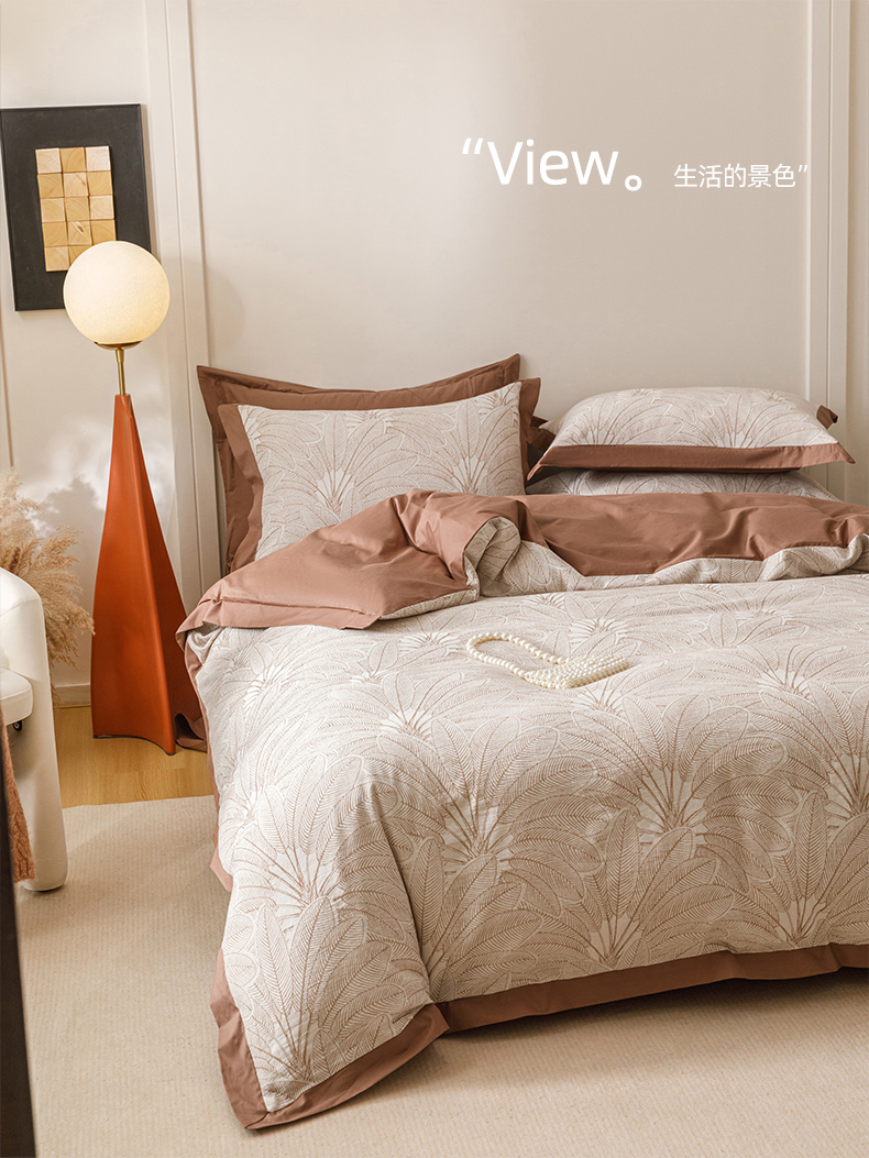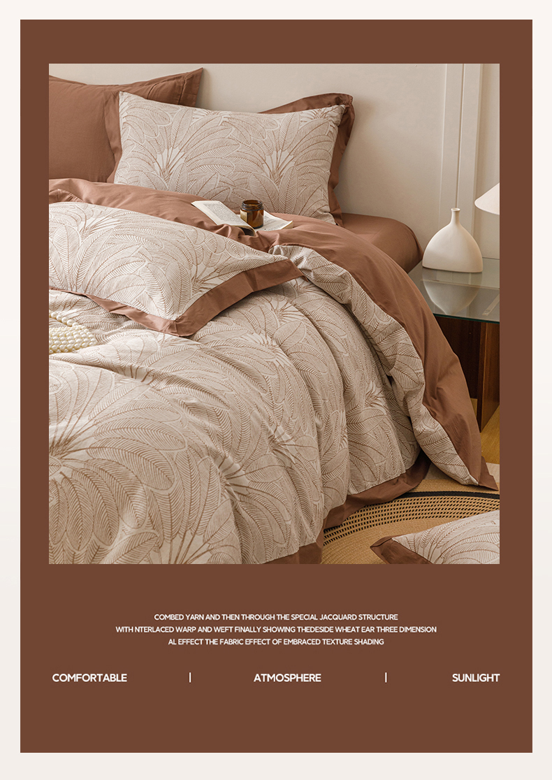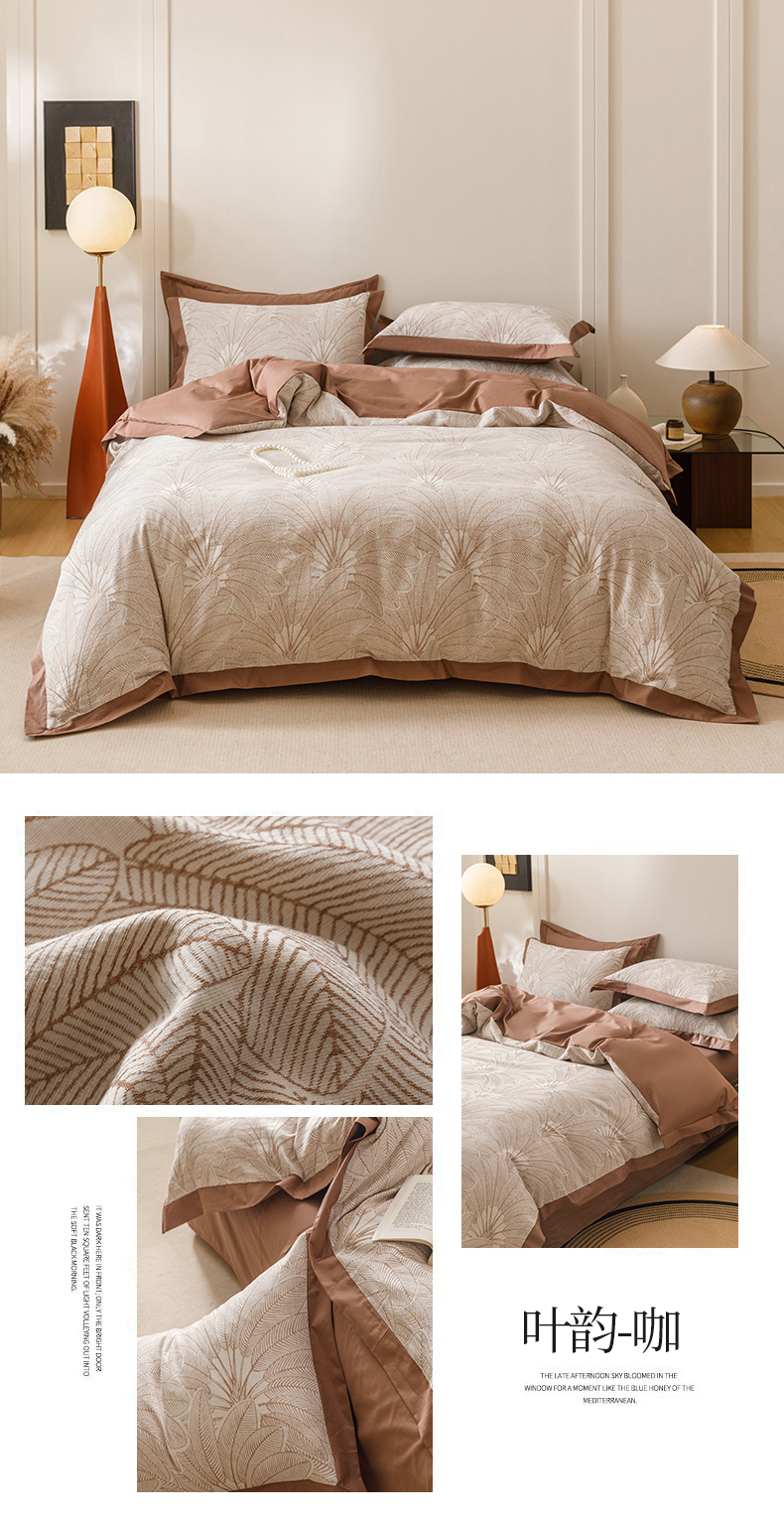 简宜家居(朝初家纺) 2025新款全棉宽边三层纱提花四件套 叶韵-咖