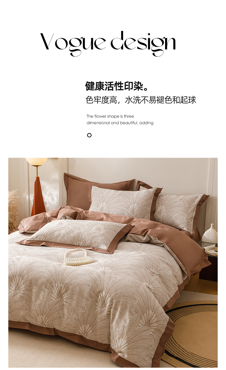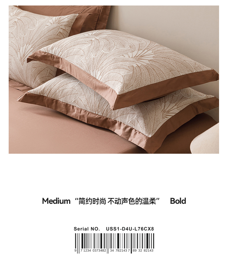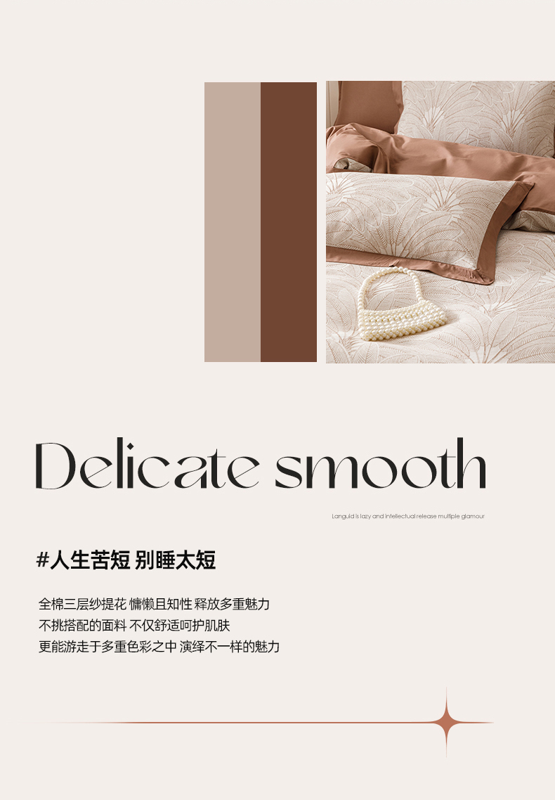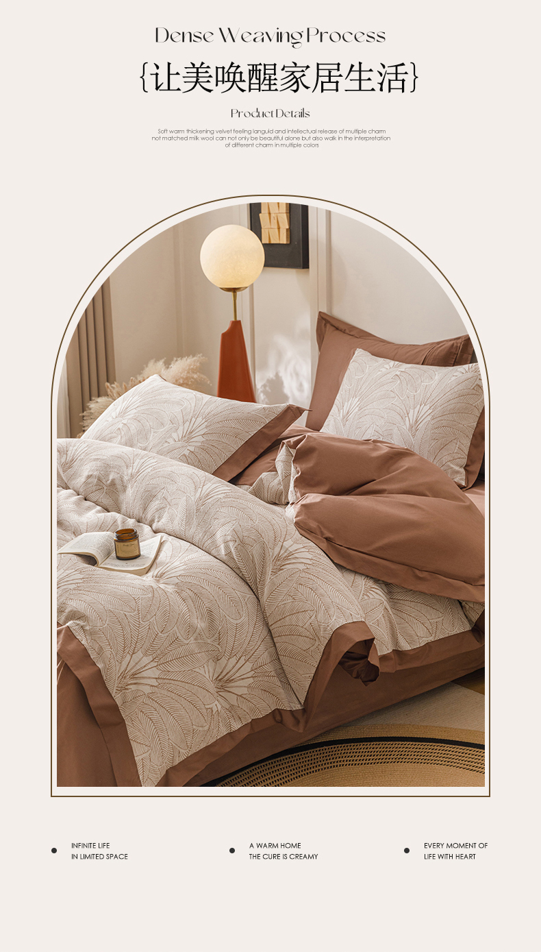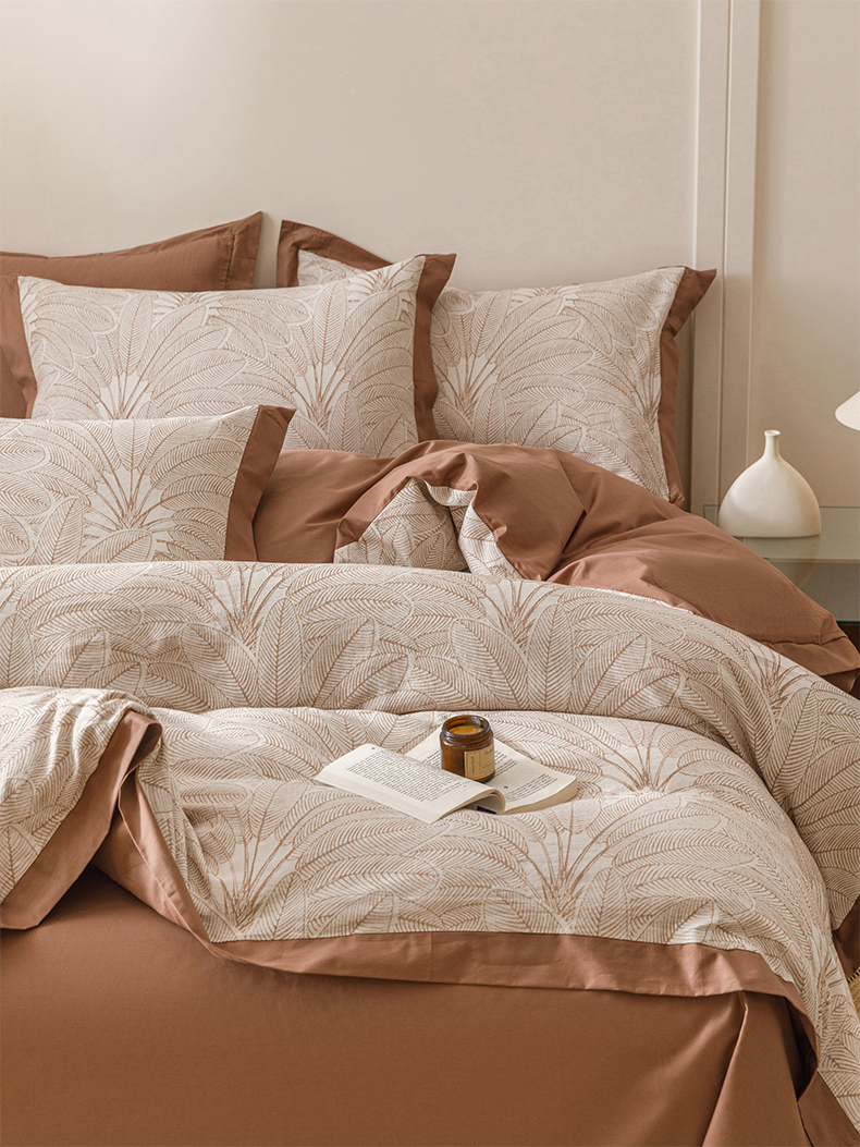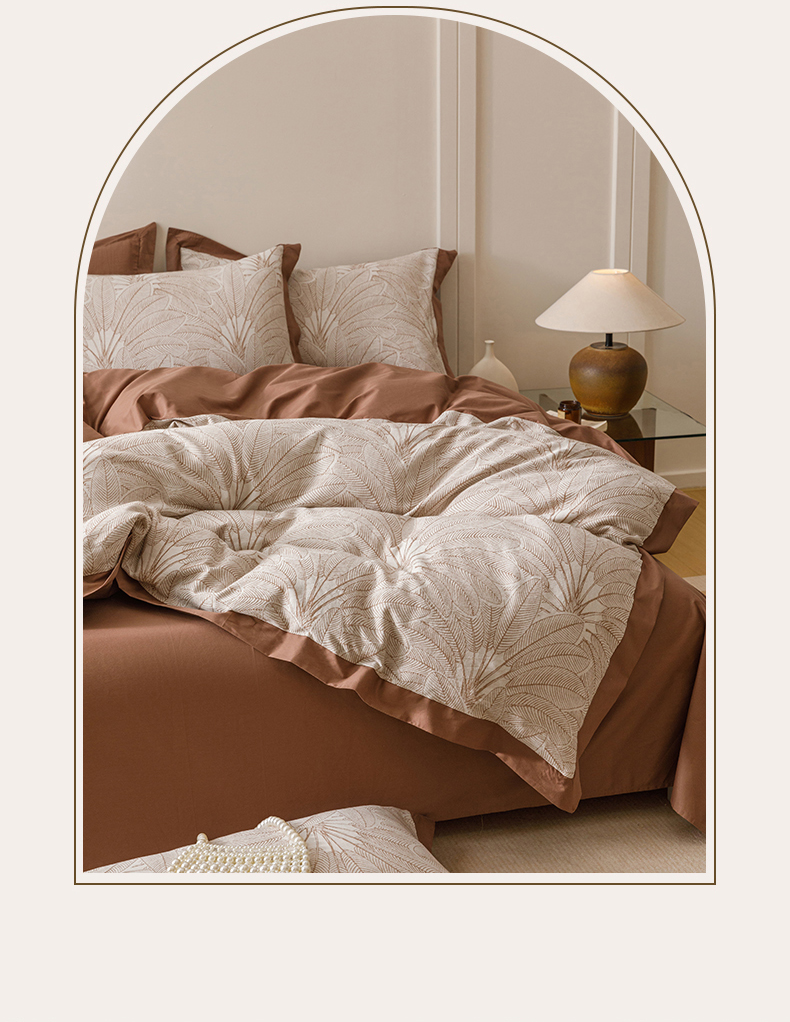 简宜家居(朝初家纺) 2025新款全棉宽边三层纱提花四件套 叶韵-咖