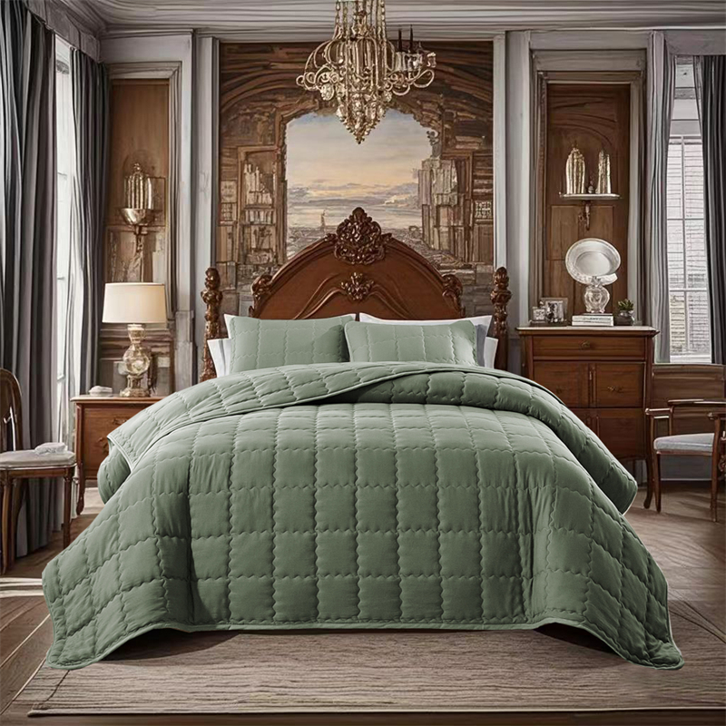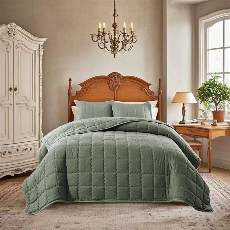 (总)温宁2025新款跨境外贸专供正方格床盖,绿色,米色,银灰