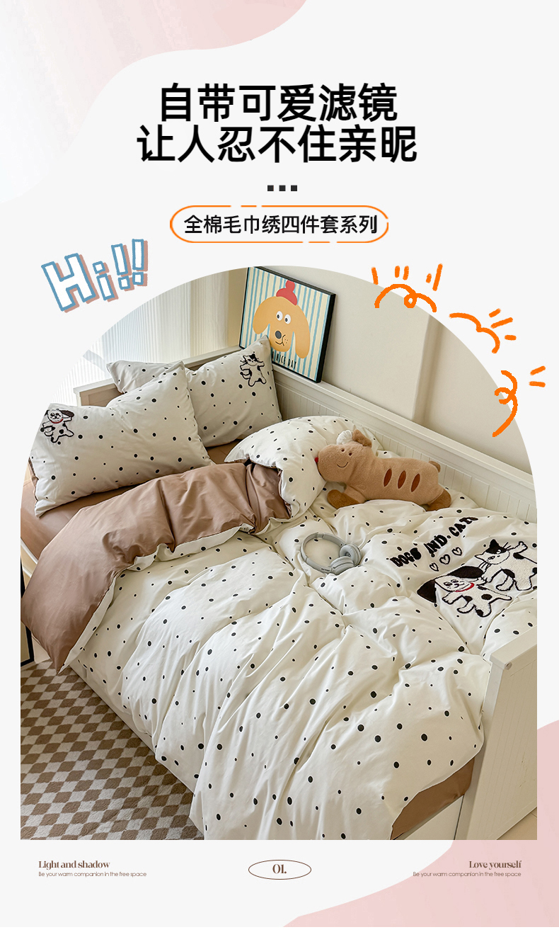 (总)TT.one 塔塔家居 2025新款暖绵绵羊羔绒毛巾绣四件套,粉粉雪世界,黄油面包狗,浪漫花花海,小狗游园会