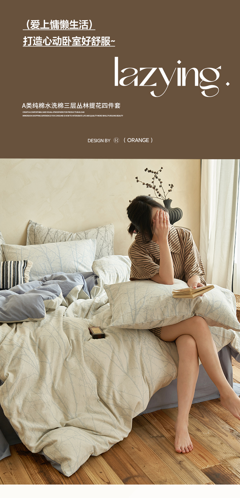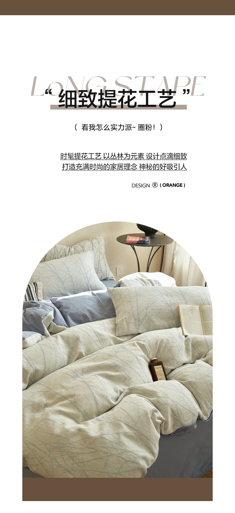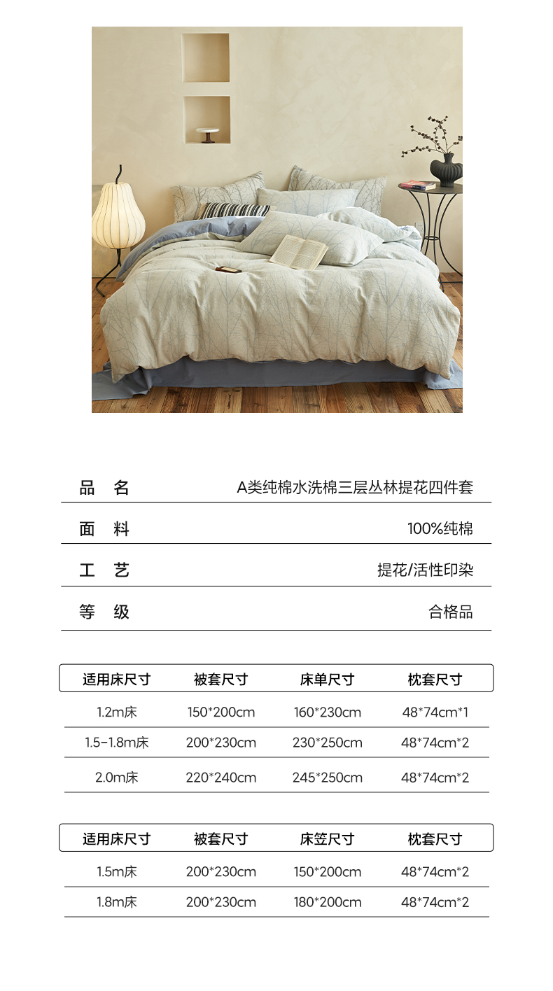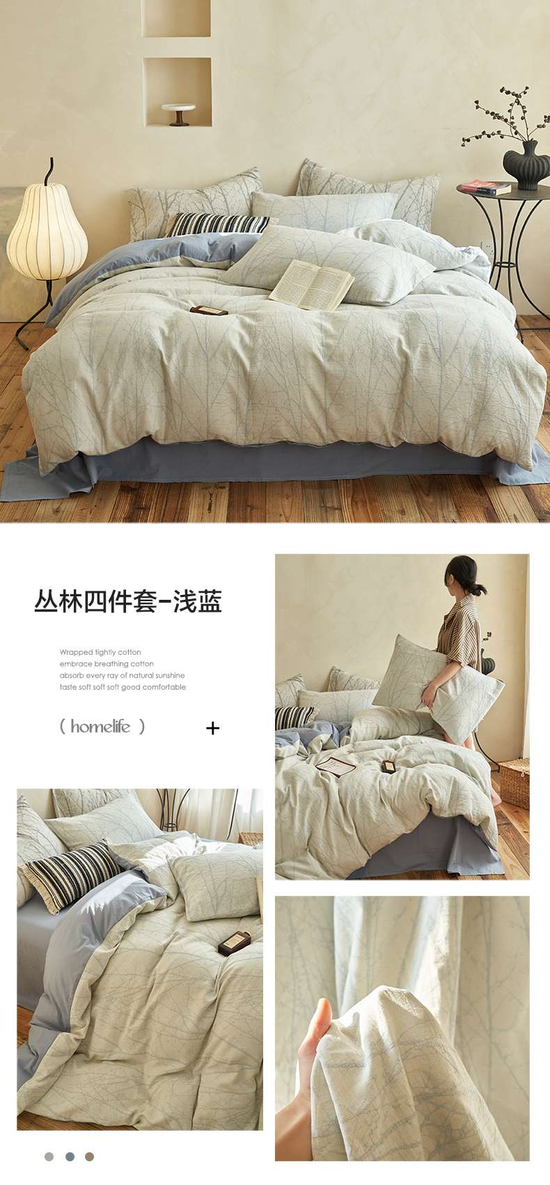 商品名称:2025新款纯棉水洗棉三层丛林提花四件套 丛林四件套-浅蓝