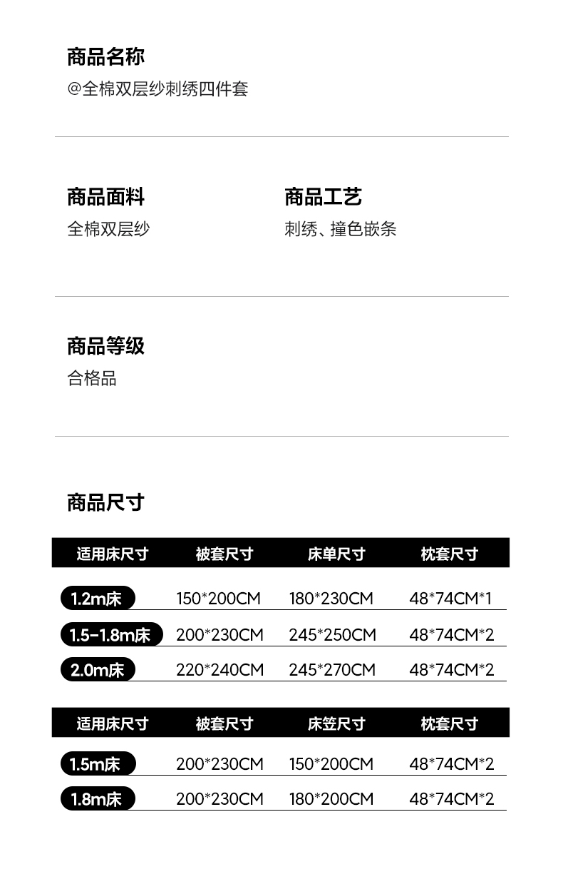 1.5床笠款:被套200*230床笠150*200枕套48*74*2只