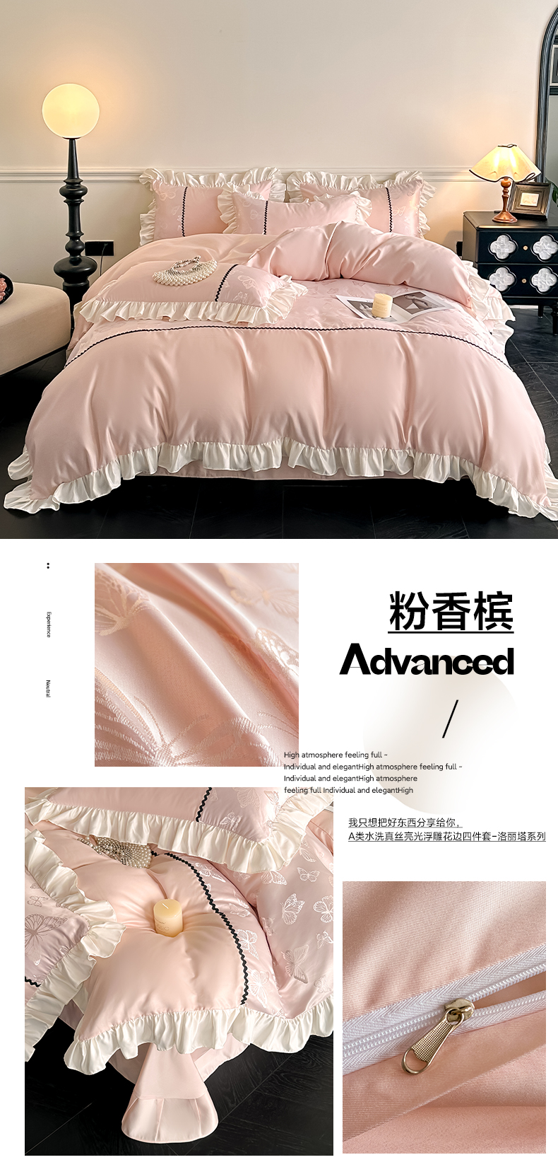 (总)米彩家纺 2025新款A类水洗真丝亮光浮雕花边四件套