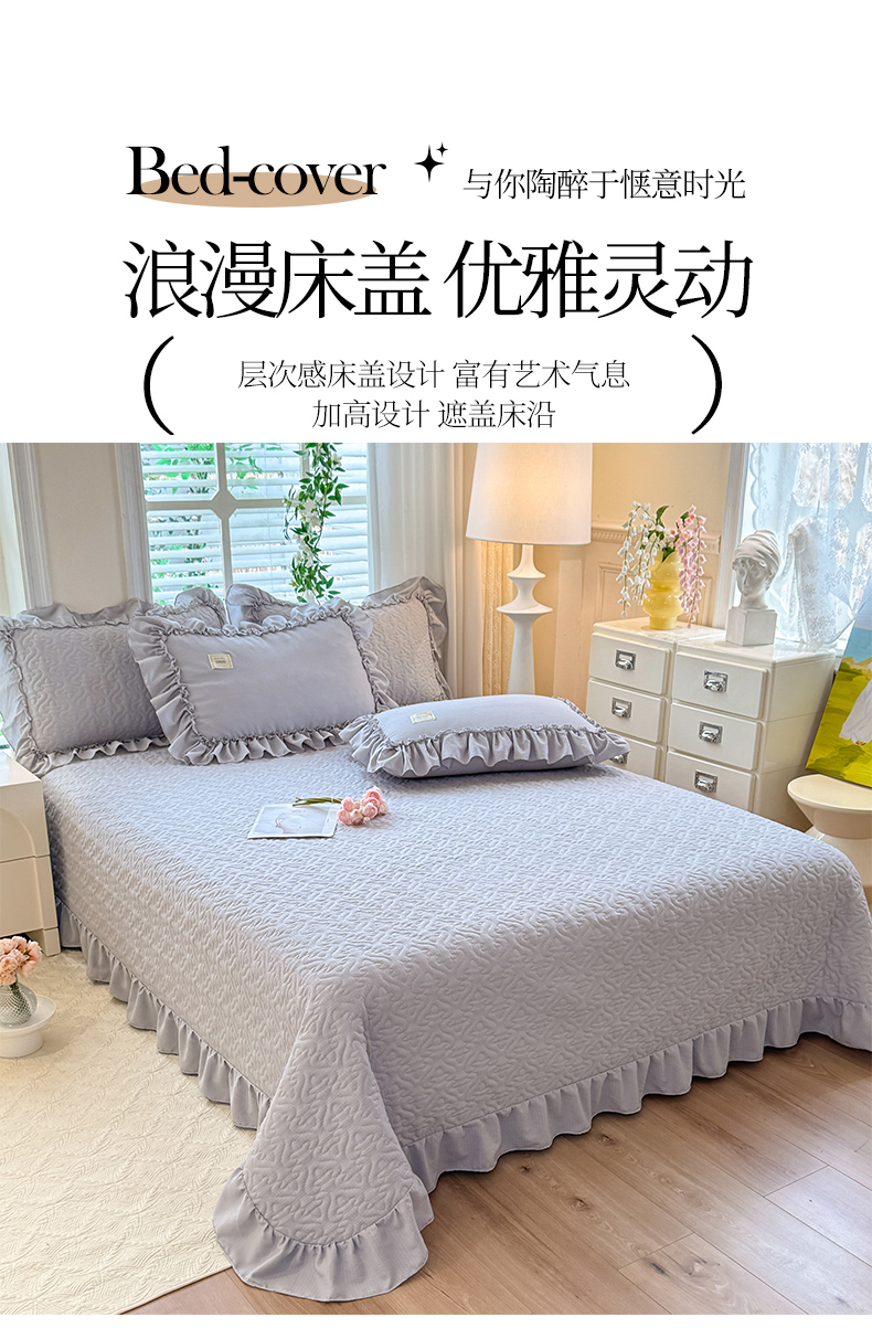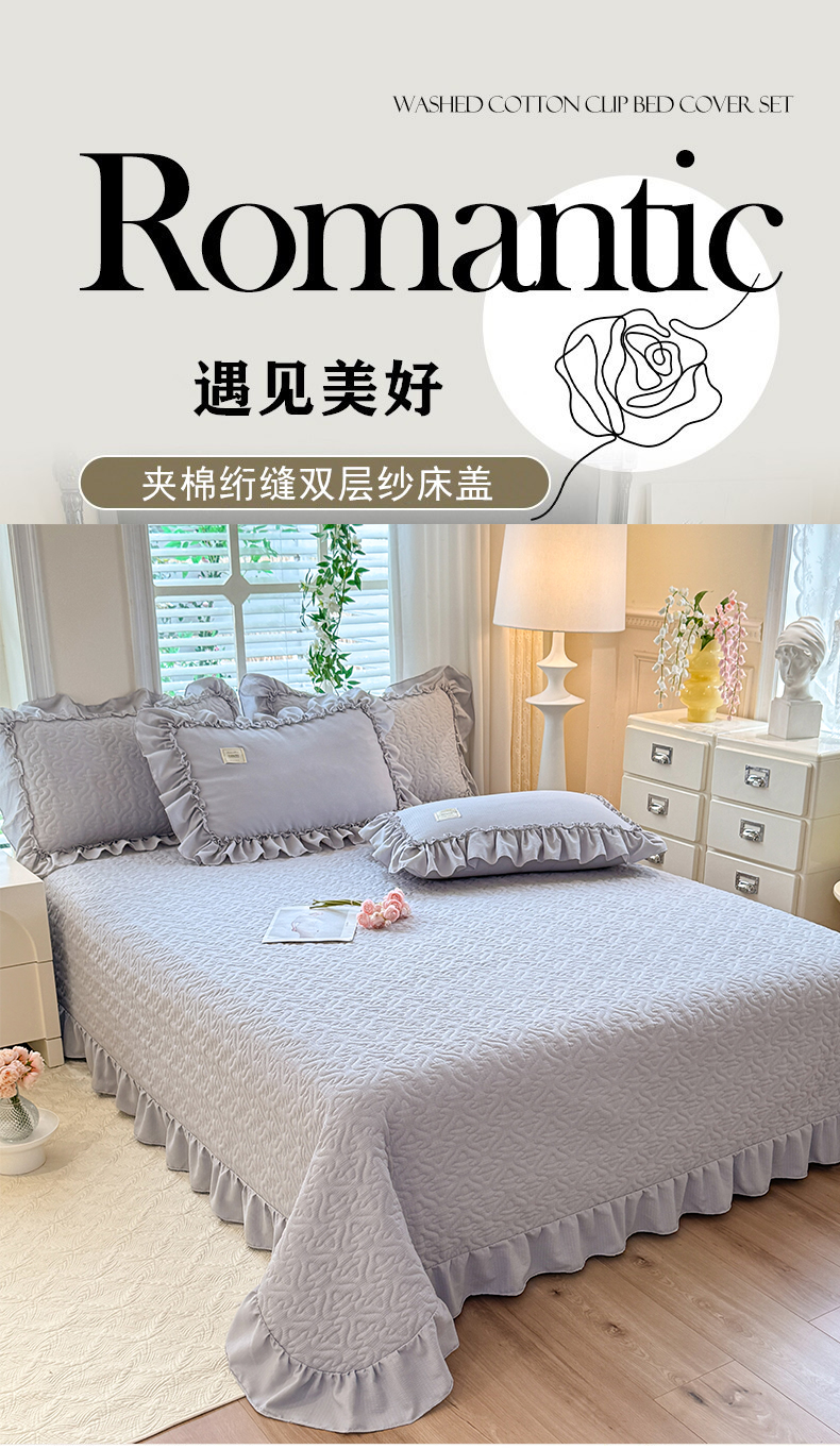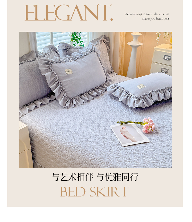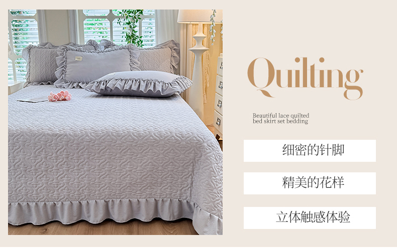 (总)花香四季家纺 2025新款夹棉绗缝床裙单件三件套法式四件套套件蕾丝公主风,灰色,绿色,米色,玉色,紫色