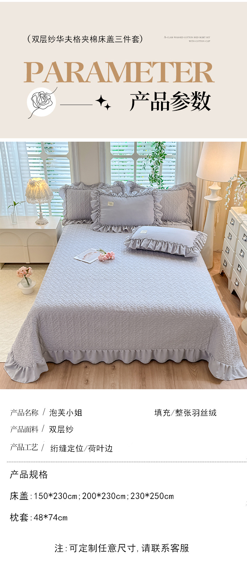 商品名称:(总)花香四季家纺 2025新款泡芙小姐双层纱华夫格柔棉夹棉绗缝床盖床垫子单件三件套