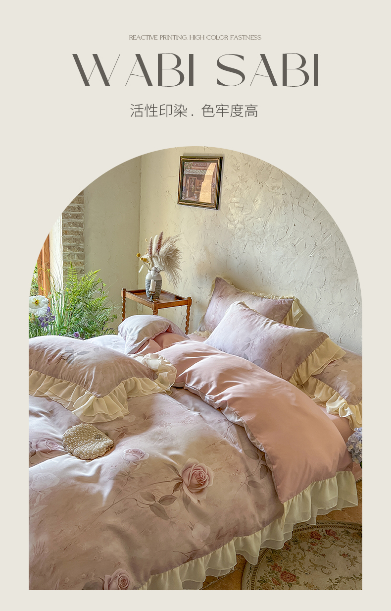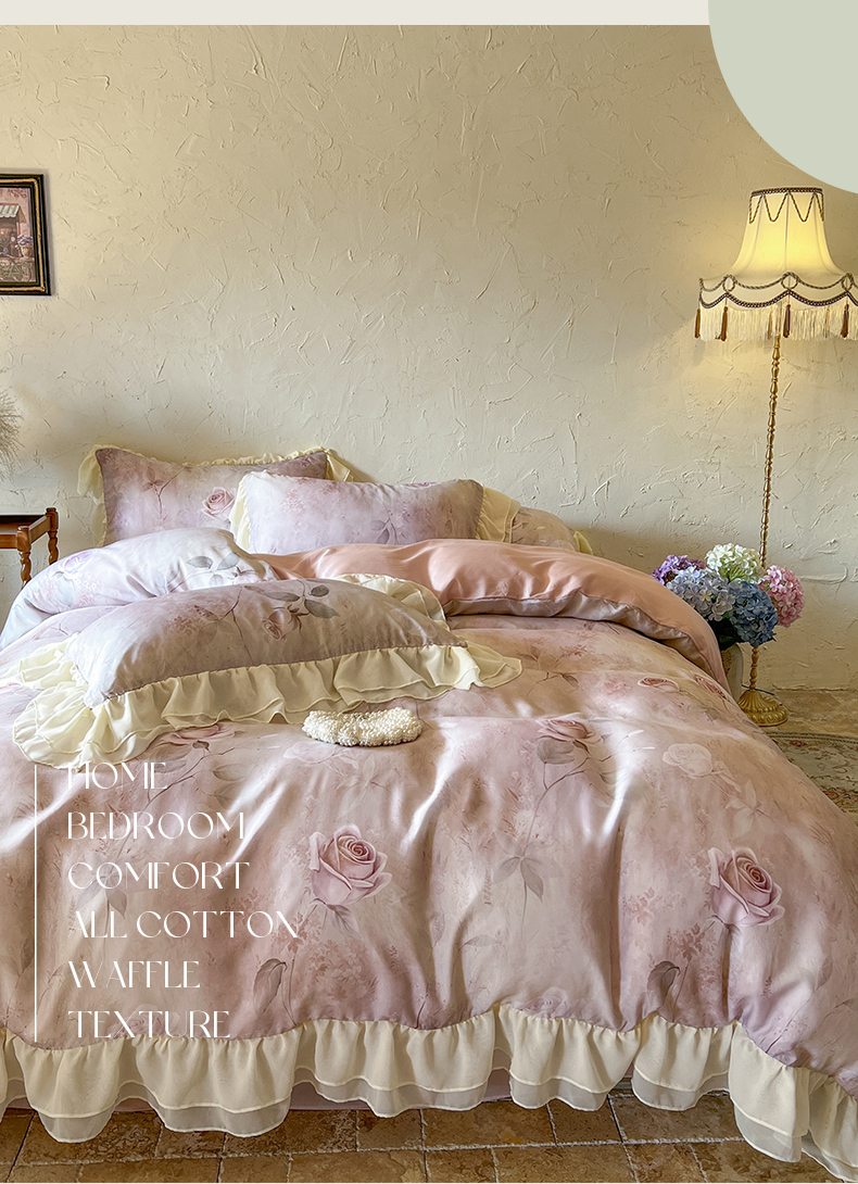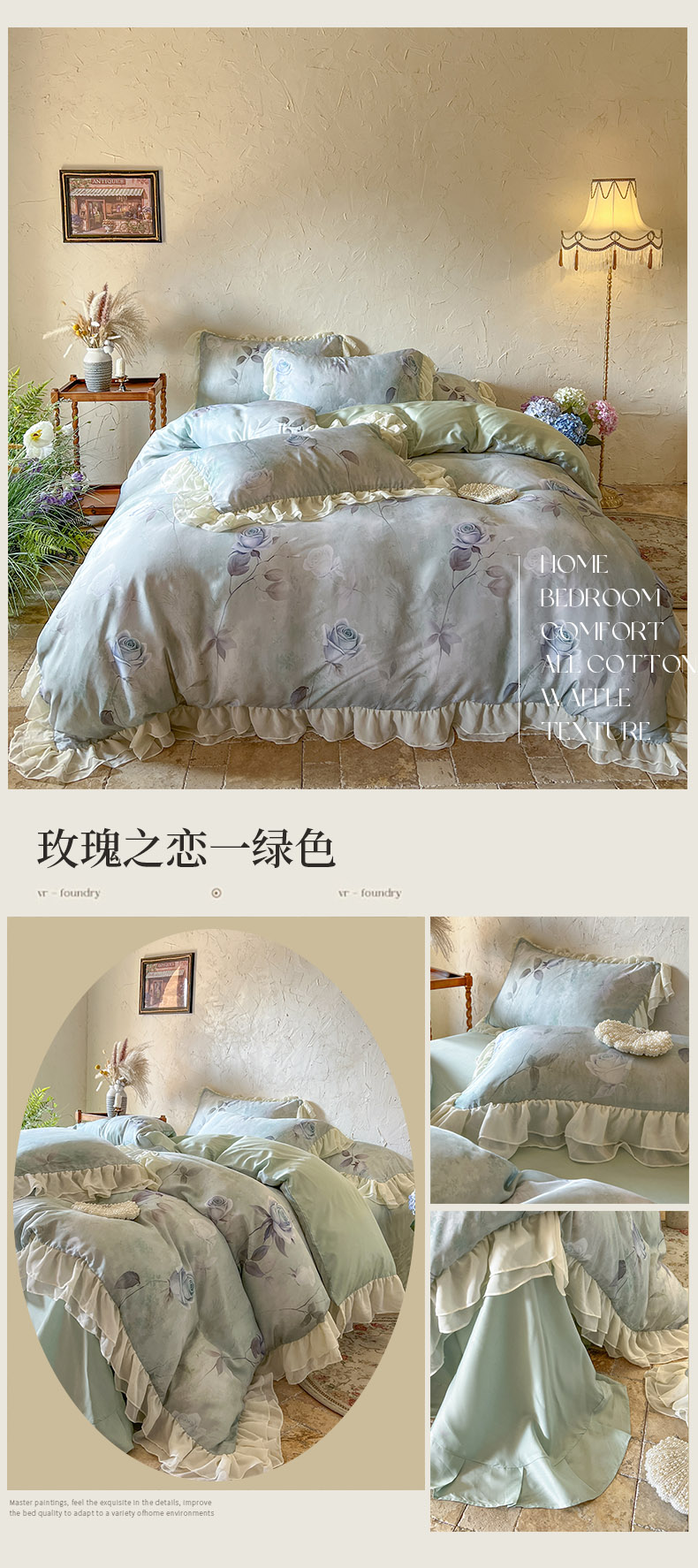 (总)亲亲公主 2025新款全棉法式宽花边四件套-玫瑰庄园,玫瑰庄园一豆沙粉,玫瑰庄园一抹茶绿