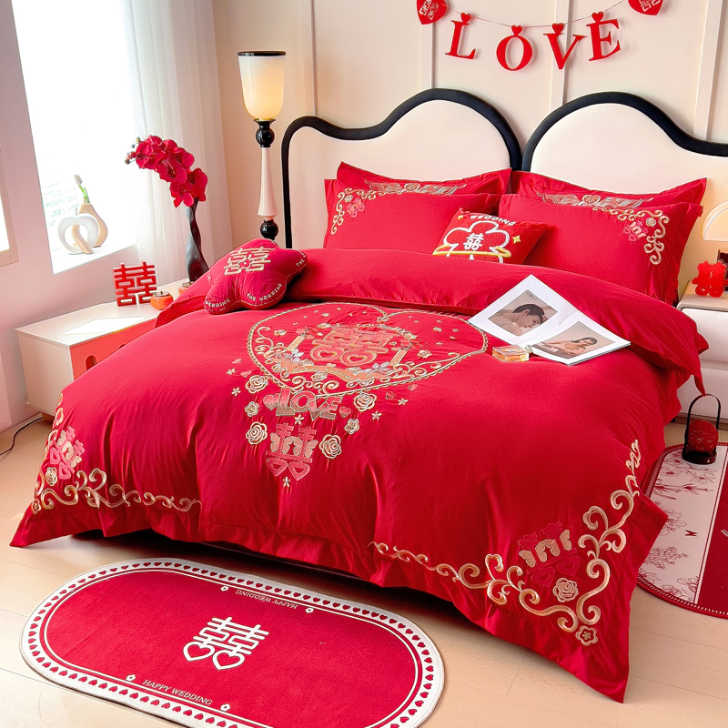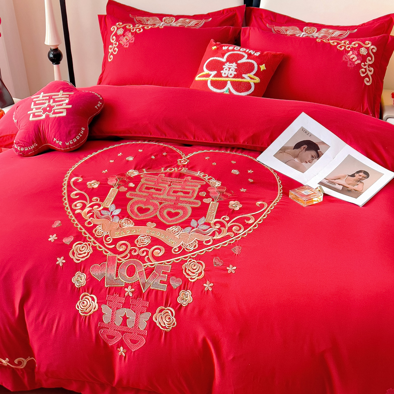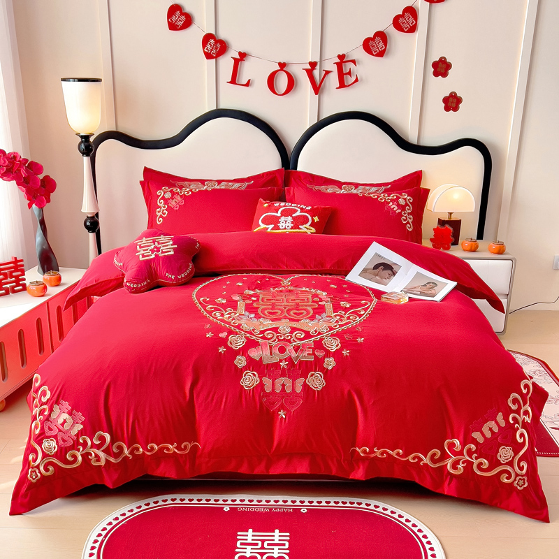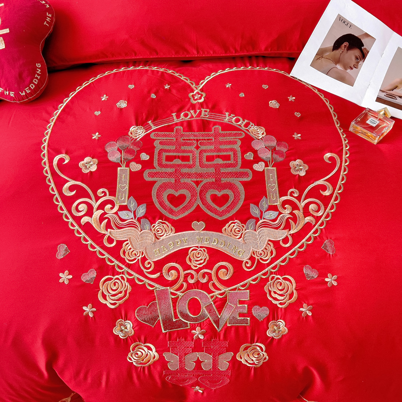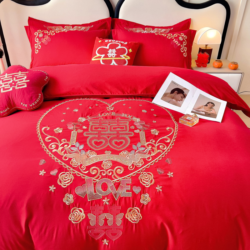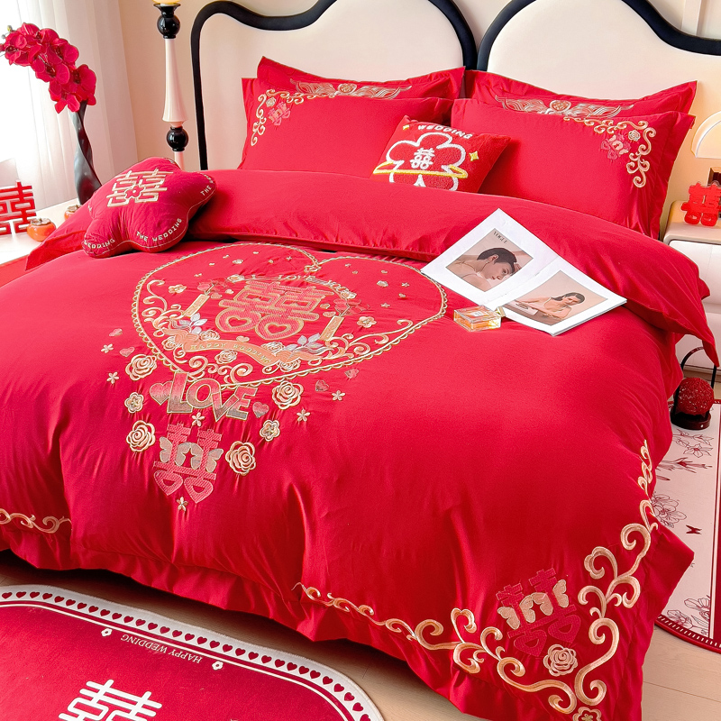 2025新款100支150克双面长绒棉婚庆绣花四件套 喜韵佳缘