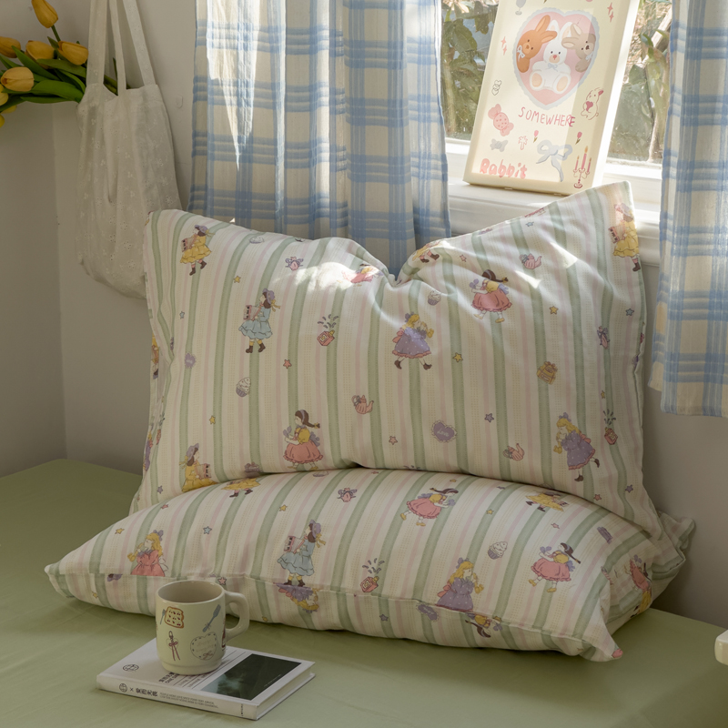 商品名称:塔塔家居 2025新款全棉纯棉双层纱枕套单品单枕套枕套单件 桃桃少女·绿