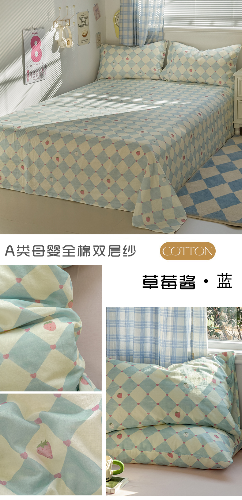 • 91家纺网 家纺一手货源 找家纺 塔塔家居  2025新款全棉纯棉双层纱床单床笠单品 草莓酱·蓝
