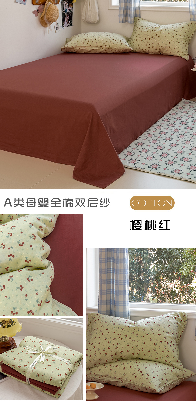 • 91家纺网 家纺一手货源 找家纺 塔塔家居  2025新款全棉纯棉双层纱床单床笠单品 小樱桃